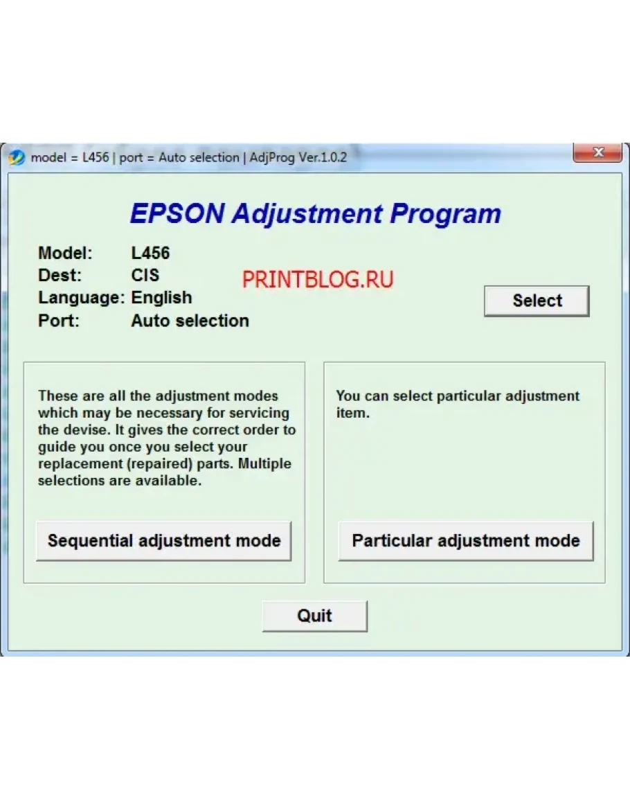 Adjustment program Epson L455, L456 - это сервисная программа для указанных моделей принтеров, программа позволяет сбросить счетчик памперса (отрботка, абсорбер), прописывать ID печатающей головки, делать инициализацию принтера и другие функции.