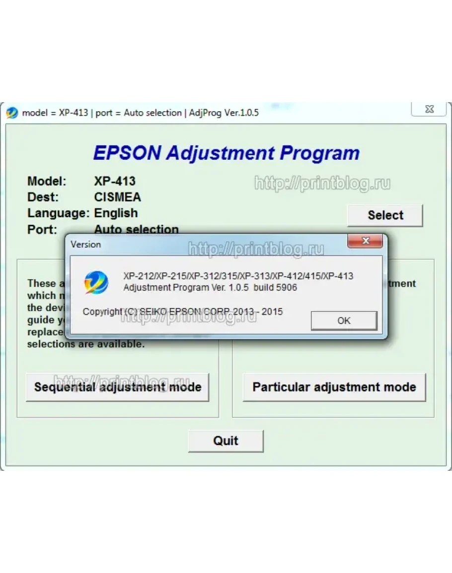 Запустите программу Adjprogr.exe двойным щелчком мыши. Появится окно с номером ID, копируете его нажатием кнопки «ОК» в этом окне (руками не набирать!) и отправляете его на наш email printb@bk.ru с темой «Я купил у вас программу Adjustment program Epson XP-215, 212, 312, 315, 313, 412, 415, 413»