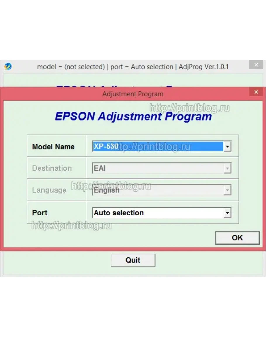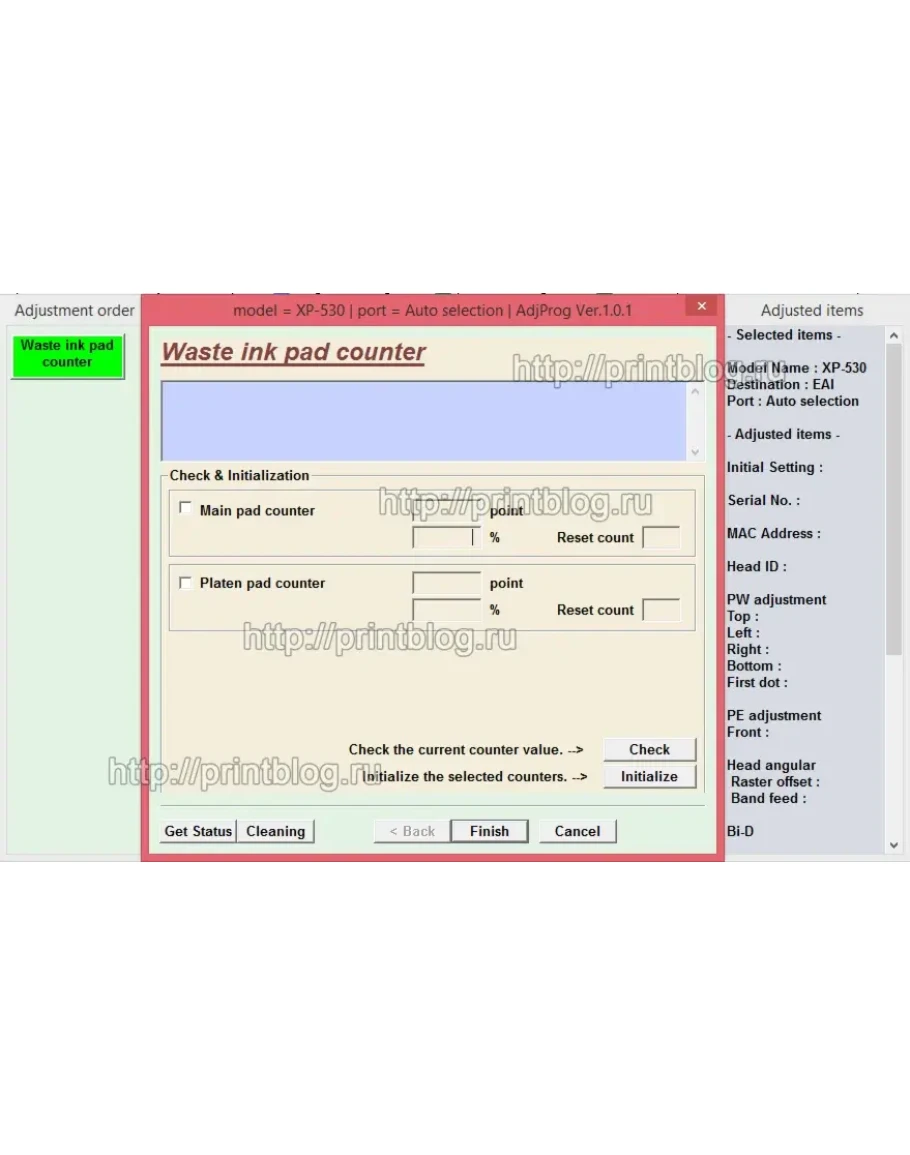 Adjustment program Epson XP-530, XP-630, XP-830 - это сервисная программа для указанных моделей принтеров, программа позволяет сбросить счетчик памперса (отработка, абсорбер), прописывать ID печатающей головки, делать инициализацию принтера и другие функции.