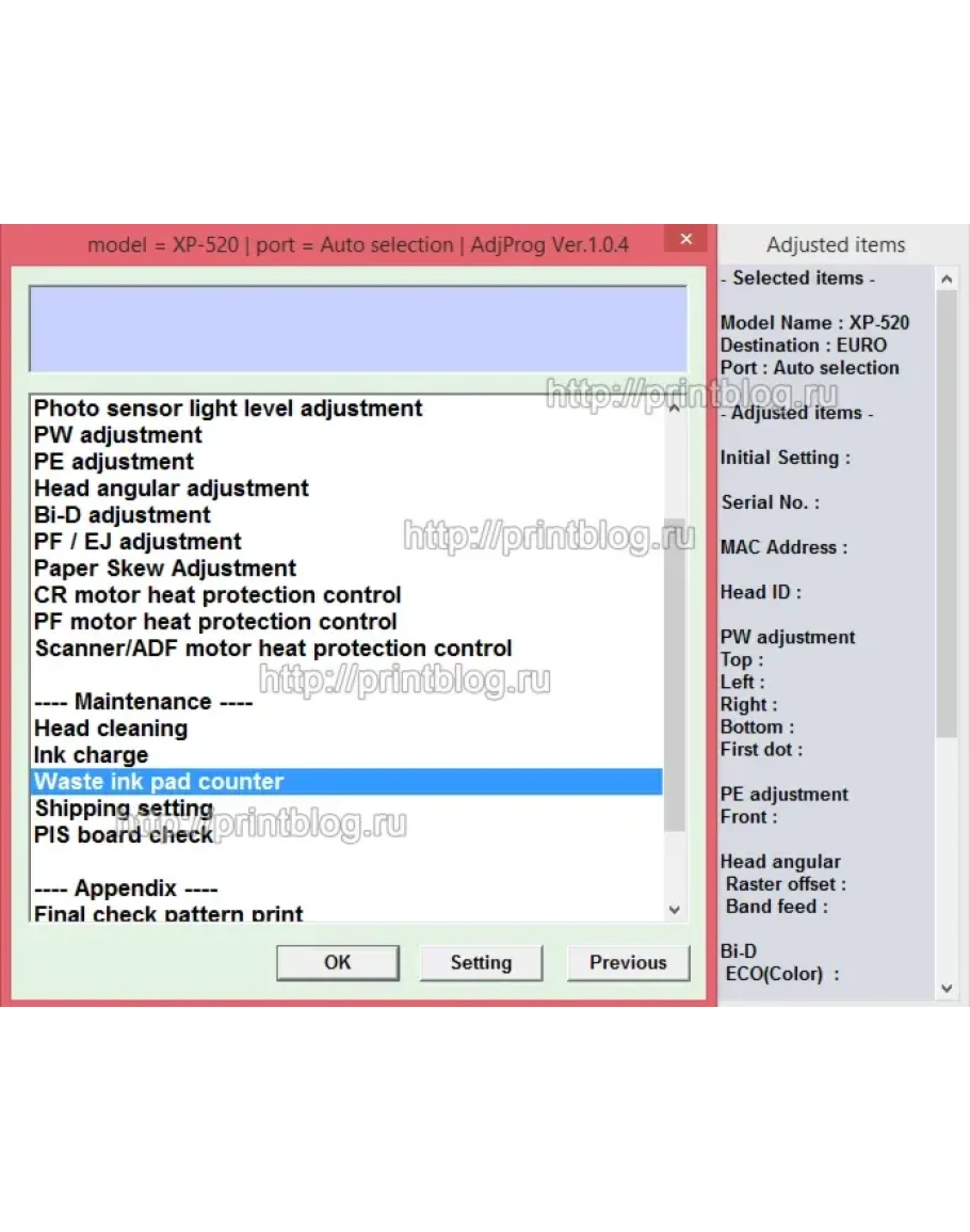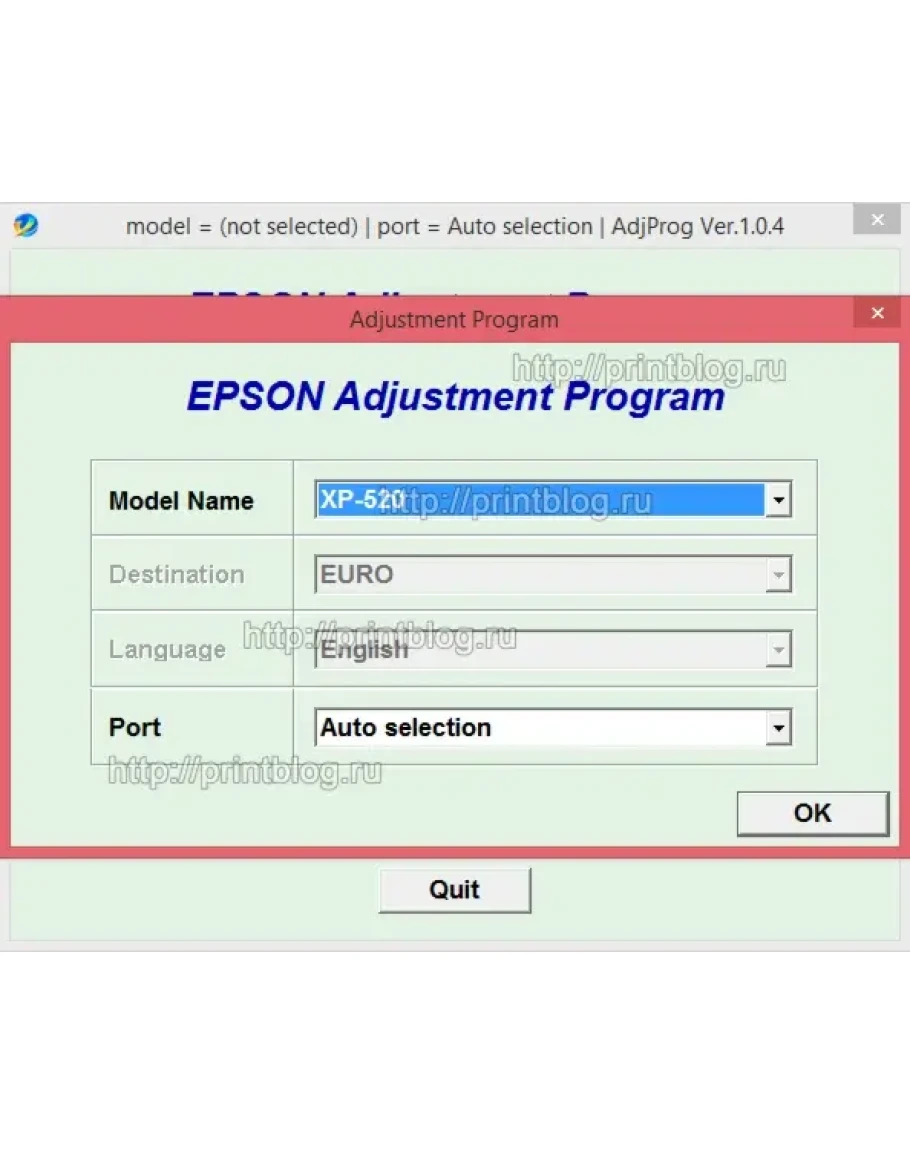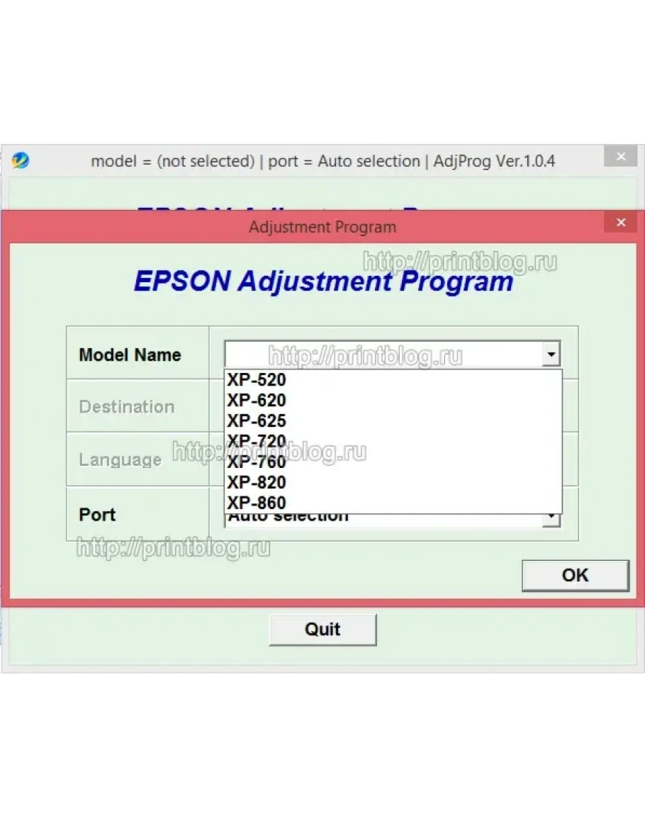 Adjustment program Epson XP520, XP620, XP625, XP720, XP760, XP820, XP860 - это сервисная программа для указанных моделей принтеров, программа позволяет сбросить счетчик памперса (отработка, абсорбер), прописывать ID печатающей головки, делать инициализацию принтера и другие функции.