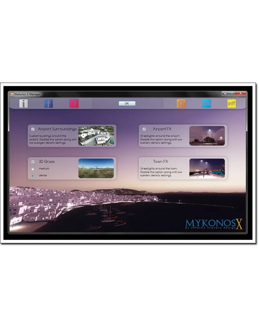Откройте для себя великолепный остров Миконос с его знаменитым международным аэропортом в потрясающей детализации. Этот высококачественный сценарий предлагает захватывающие подходы над живописным рельефом, бухтами и белоснежными пляжами. Воссоздана уникальная архитектура острова с характерными белыми фасадами и голубыми окнами.