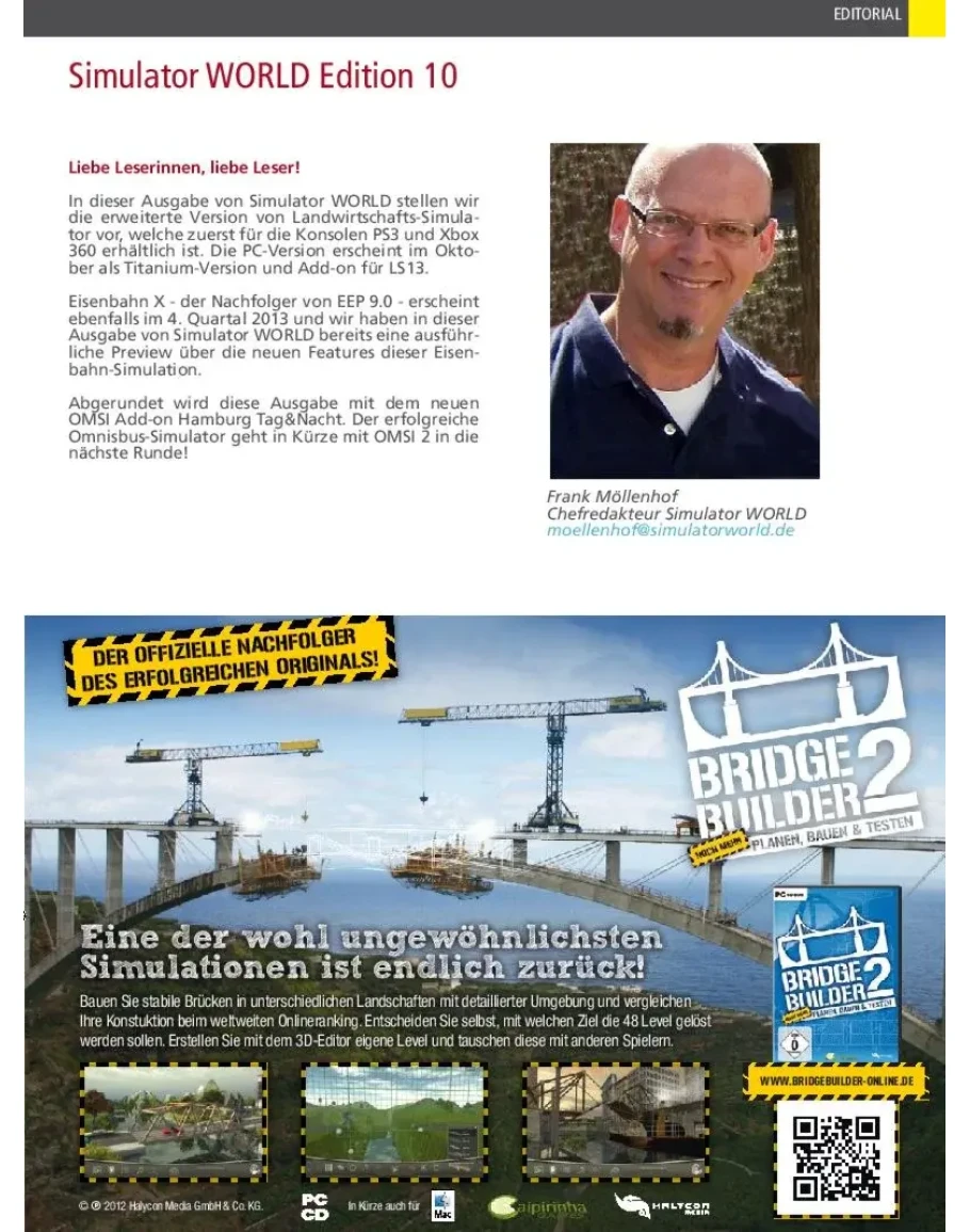 Официальный выпуск журнала Simulator World за октябрь 2013 года на немецком языке. Это профессиональное издание для энтузиастов симуляторов, включающее обзоры новейших релизов и дополнений. В номере представлены материалы о Farming Simulator, Train Simulator 2013, OMSI и других популярных симуляторах.