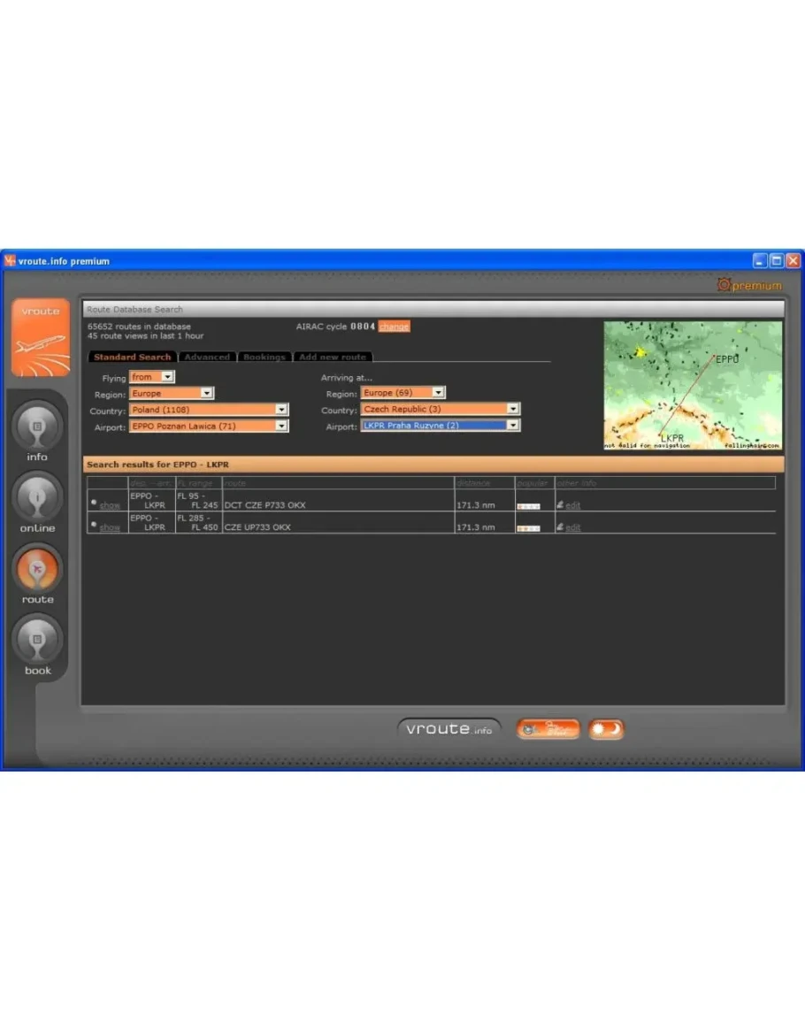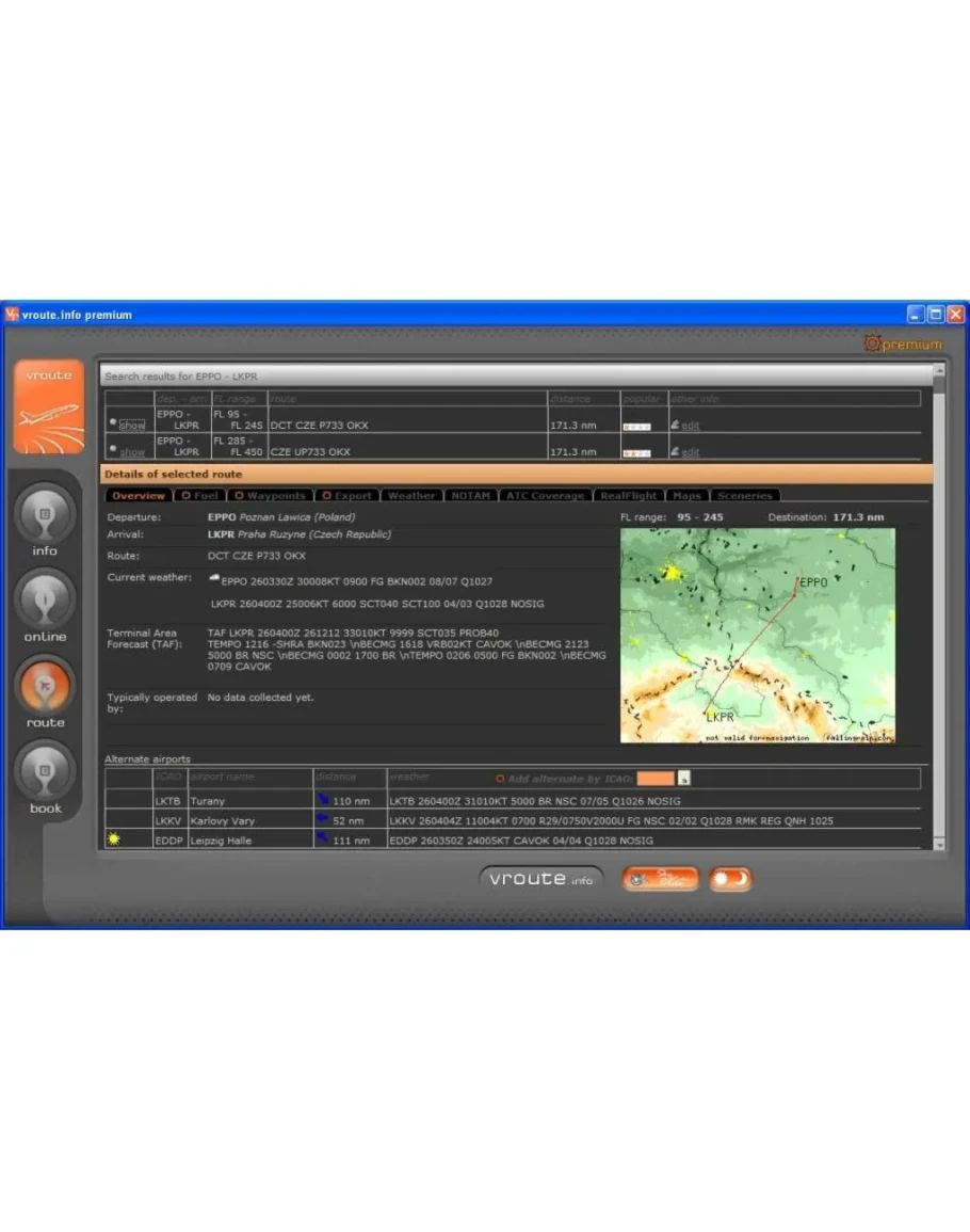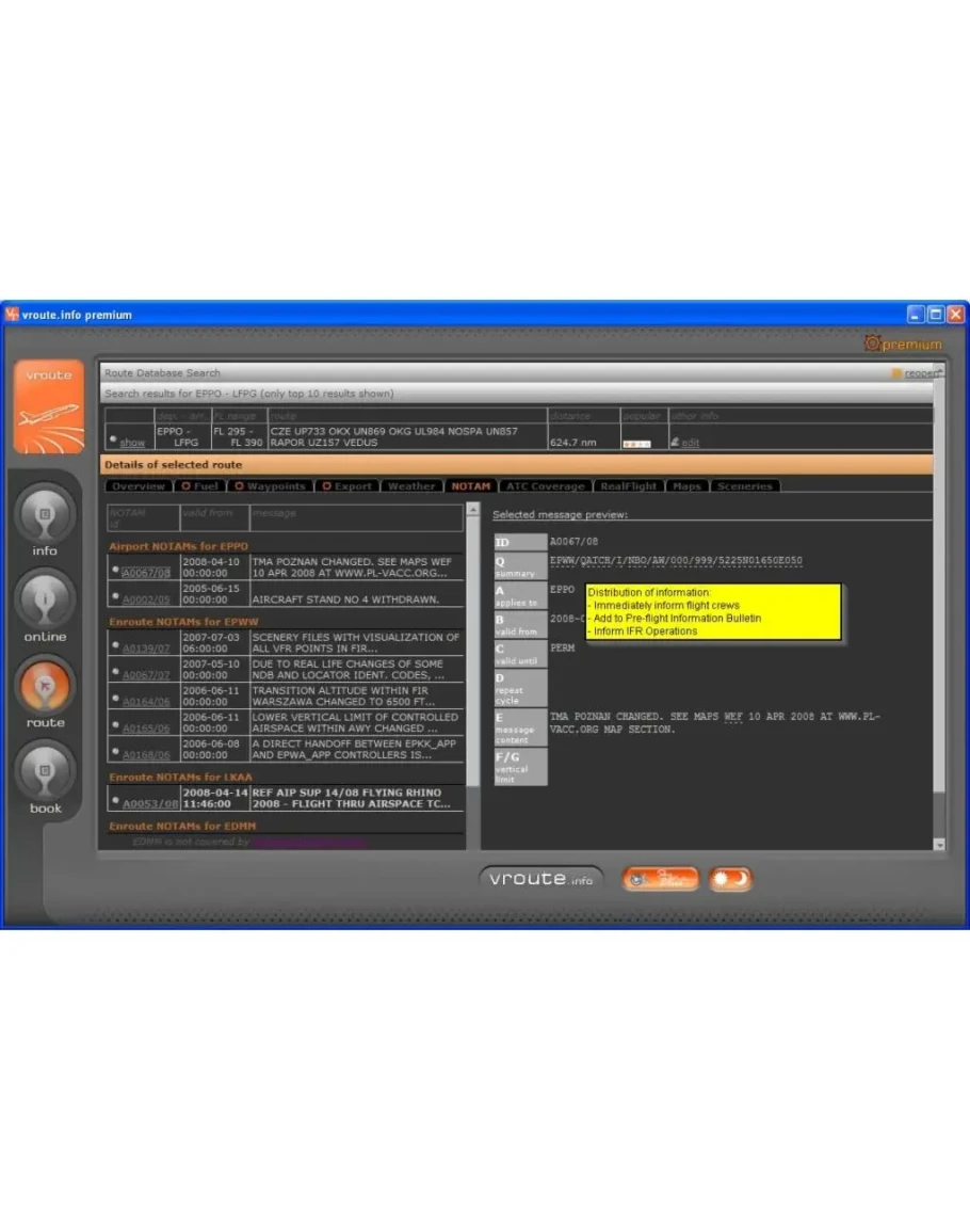 VROUTE.INFO PREMIUM - это профессиональный инструмент планирования полетов с обширной базой данных маршрутов и расчетом топлива. Программа включает детальные карты воздушного пространства, аэронавигационные карты и информацию о трафике в реальном времени. Создана для серьезных энтузиастов авиасимуляции, желающих получить максимально реалистичный опыт планирования полетов.