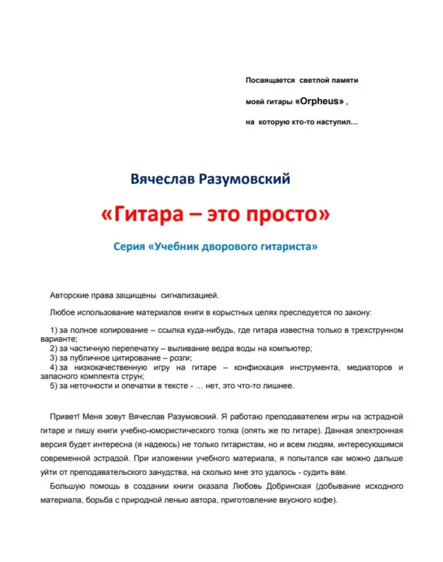 Книги Вячеслава Разумовского представляют собой учебные пособия для начинающих гитаристов с рассказами о ведущих музыкантах и рок-группах. Учебный материал проиллюстрирован качественными примерами различной степени сложности. Безусловная заслуга автора в том, что он напрочь откинул академическую серьезность и разговаривает с молодежью на понятном и доступном языке, с изрядной долей юмора. Собственно, читатель и не чувствует, что его учат, хотя получает в достаточном объёме знания по теории и технике игры на гитаре. Книги представляют интерес не только для гитаристов, но и для всех людей, интересующихся современной эстрадой. - П.И. Окуневич, художественный руководитель музыкальной школы № 33 г. Витебска