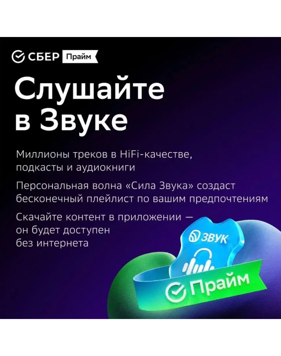 • Все преимущества «СберПрайм» Музыка, подкасты и аудиокниги в сервисе «Звук», бонусы «Спасибо» в «Самокате», «Купере», «Ситидрайве», бесплатное обслуживание карты, надбавки по «СберВкладу» и др.