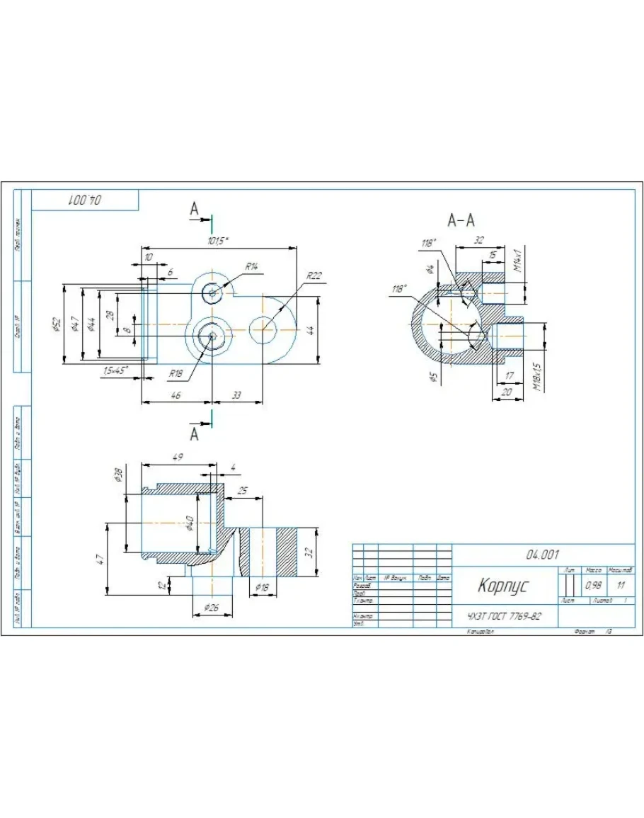 Рабочий чертеж и 3D модель детали корпус 04.001 из сборки 04.000 гидроцилиндр рабочий тормозной из сборника по деталированию Аксарина. Чертеж и модель выполнены в программе Компас 3D