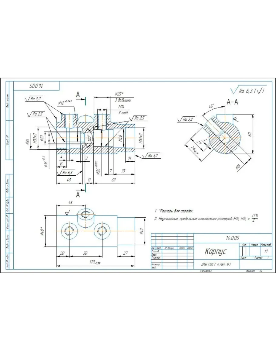 Рабочий чертеж детали корпус 14.005 из сборки 14.000 пневмораспределитель из альбома по деталированию Аксарина. Чертеж выполнен в компасе