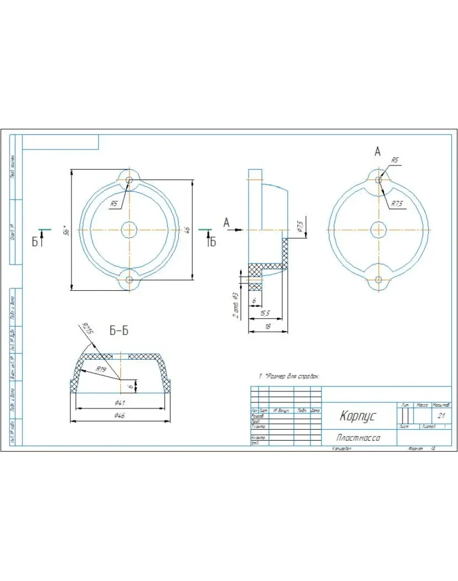 3D модель и рабочий чертеж детали корпус 16.01 из сборки 16.00 кнопка замыкания. Чертеж и модель выполнены в программе Компас 3D