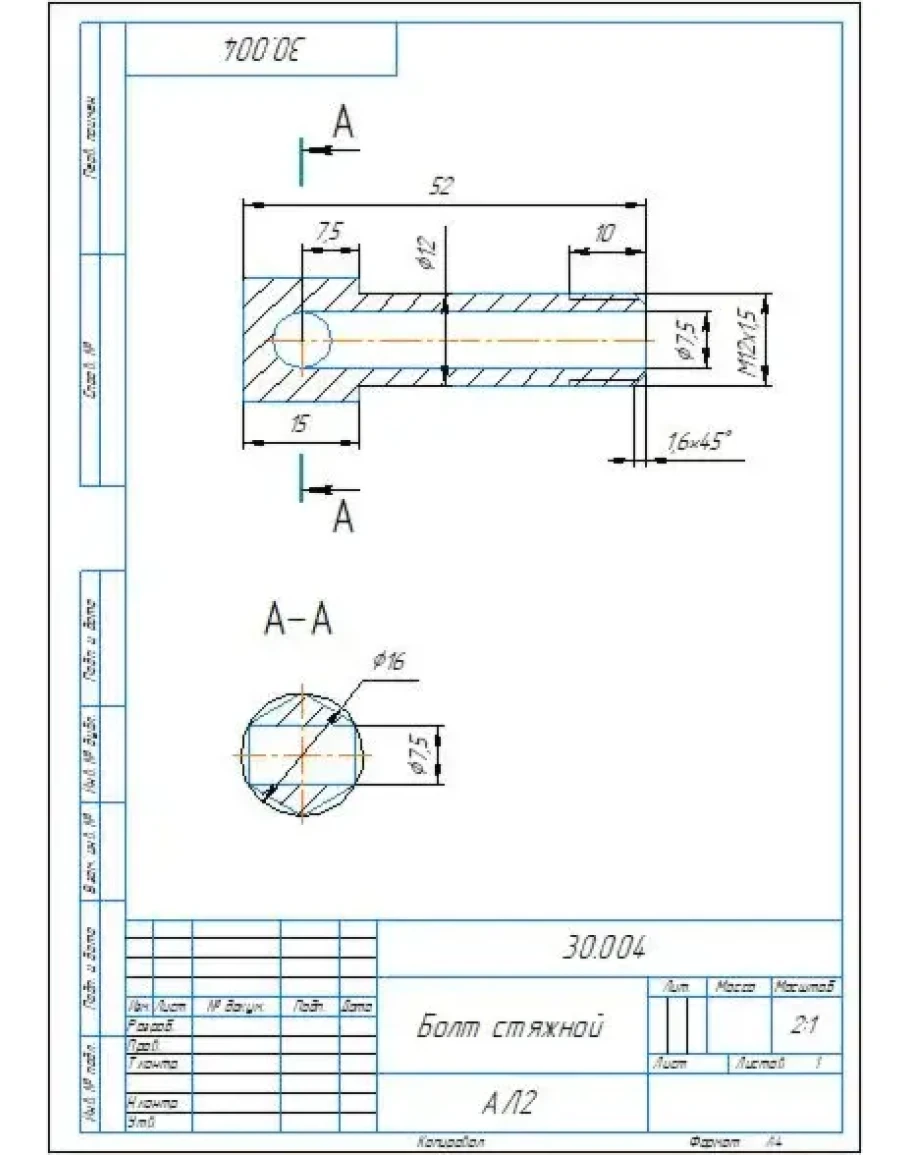 Рабочий чертеж и 3D модель детали Болт стяжной 30.004 из сборника по деталированию Аксарина