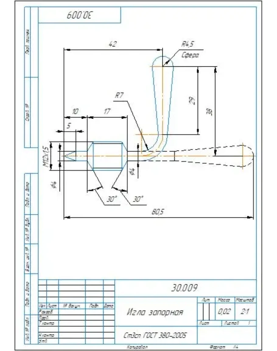 Рабочий чертеж и 3D модель детали игла запорная 30.009 из сборника по деталированию Аксарина