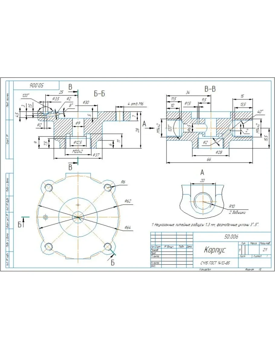 Рабочий чертеж детали корпус 50.006 из сборки 50.000 пневмоклапан давления из альбома по деталированию Аксарина. Чертеж выполнен в Компас 3D