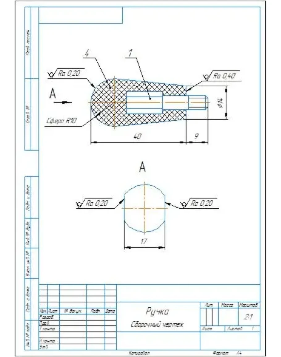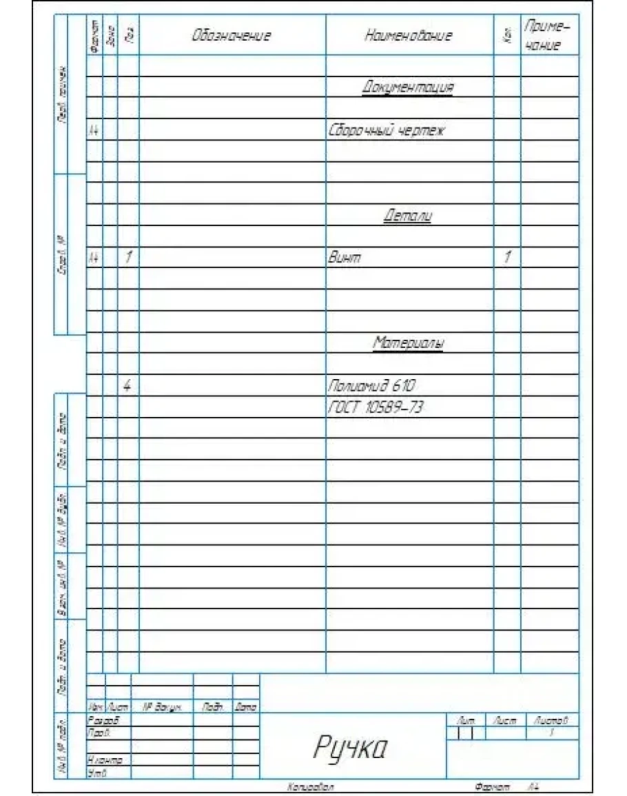 Сборочный чертеж, спецификация, деталировка армированного изделия "Ручка" в программе Компас 3D.