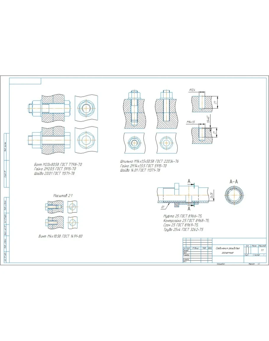 Чертеж болтового соединения М20, шпилечного соединения М14х1,5, винтового соединения М4, трубного соединения G1 в программе Компас 3D