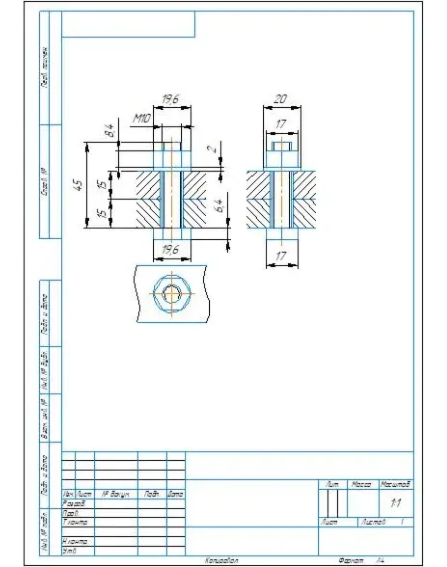 Чертеж болтового соединения с диаметром резьбы М10 в программе Компас 3D