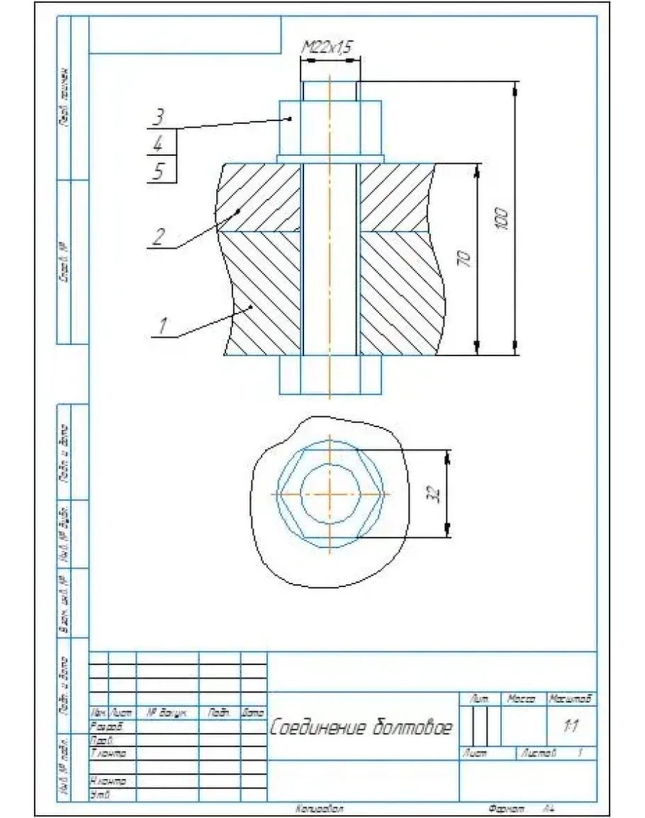 Чертеж болтового соединения М22х1,5 в программе Компас 3D