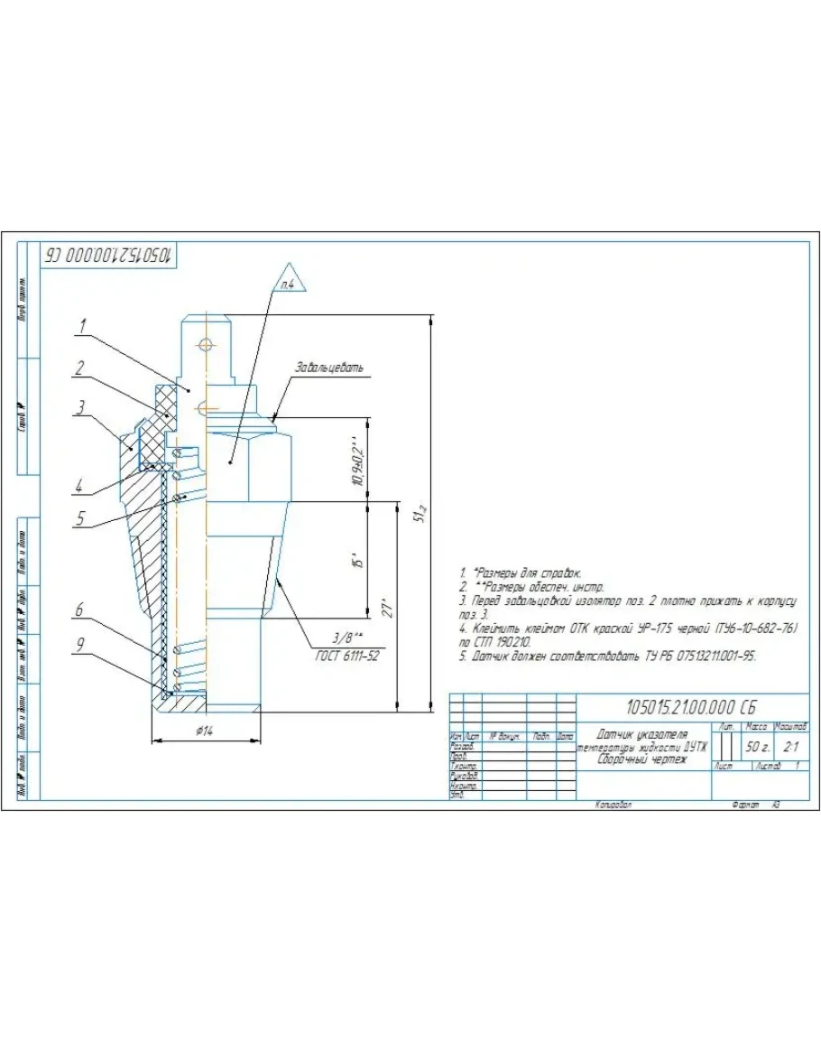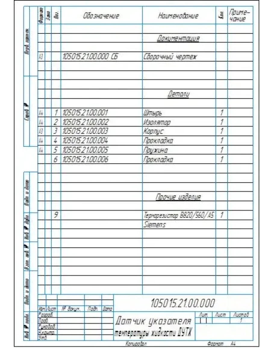 Сборочный чертеж и спецификация датчика указателя температуры жидкости ДУТЖ в компасе