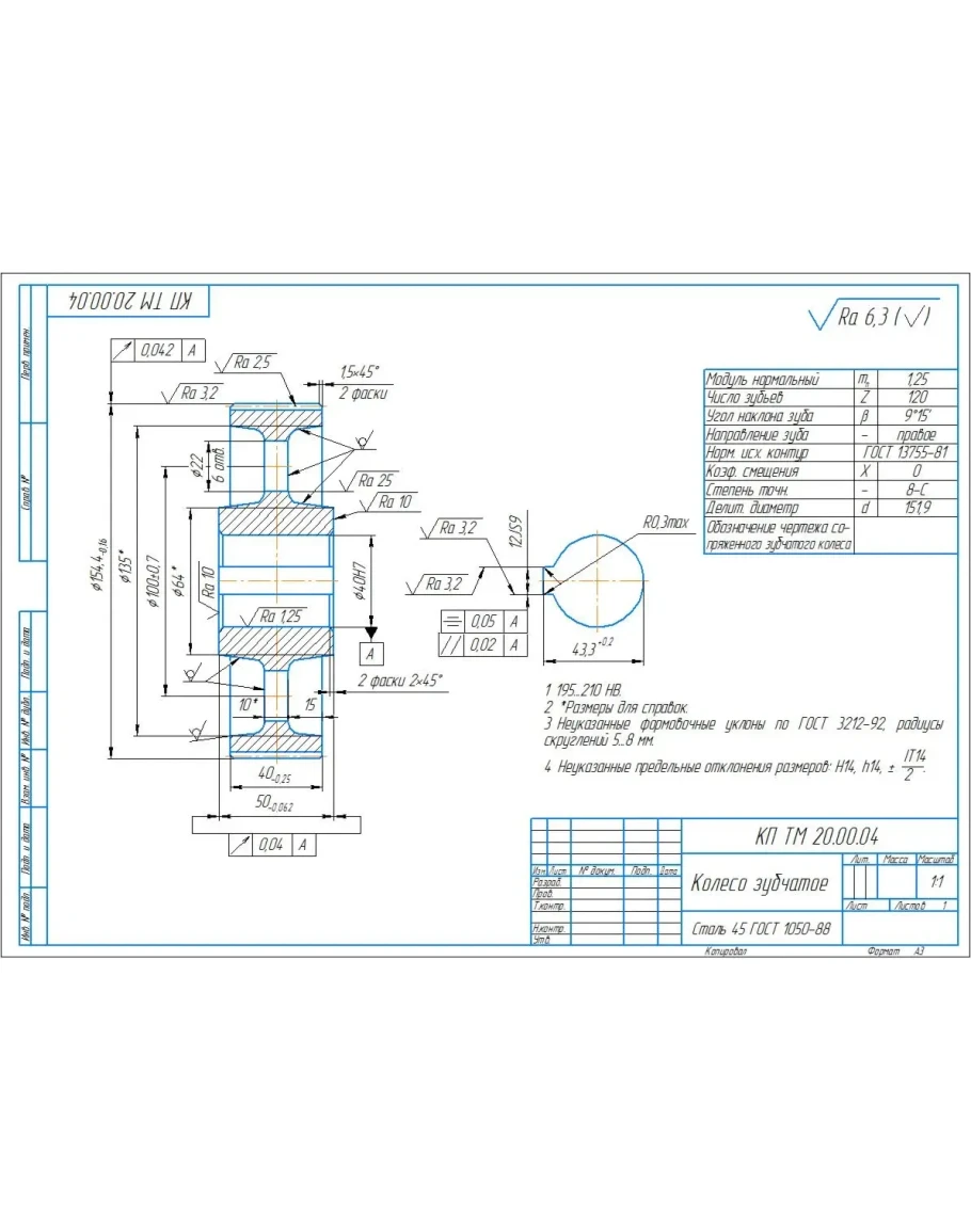 Рабочий чертеж детали колесо зубчатое цилиндрическое косозубое в компасе (m=1,25, z=120)