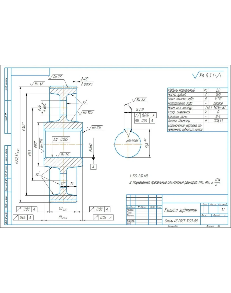 Чертеж детали колесо зубчатое цилиндрическое косозубое в компасе (m=2, z=100)