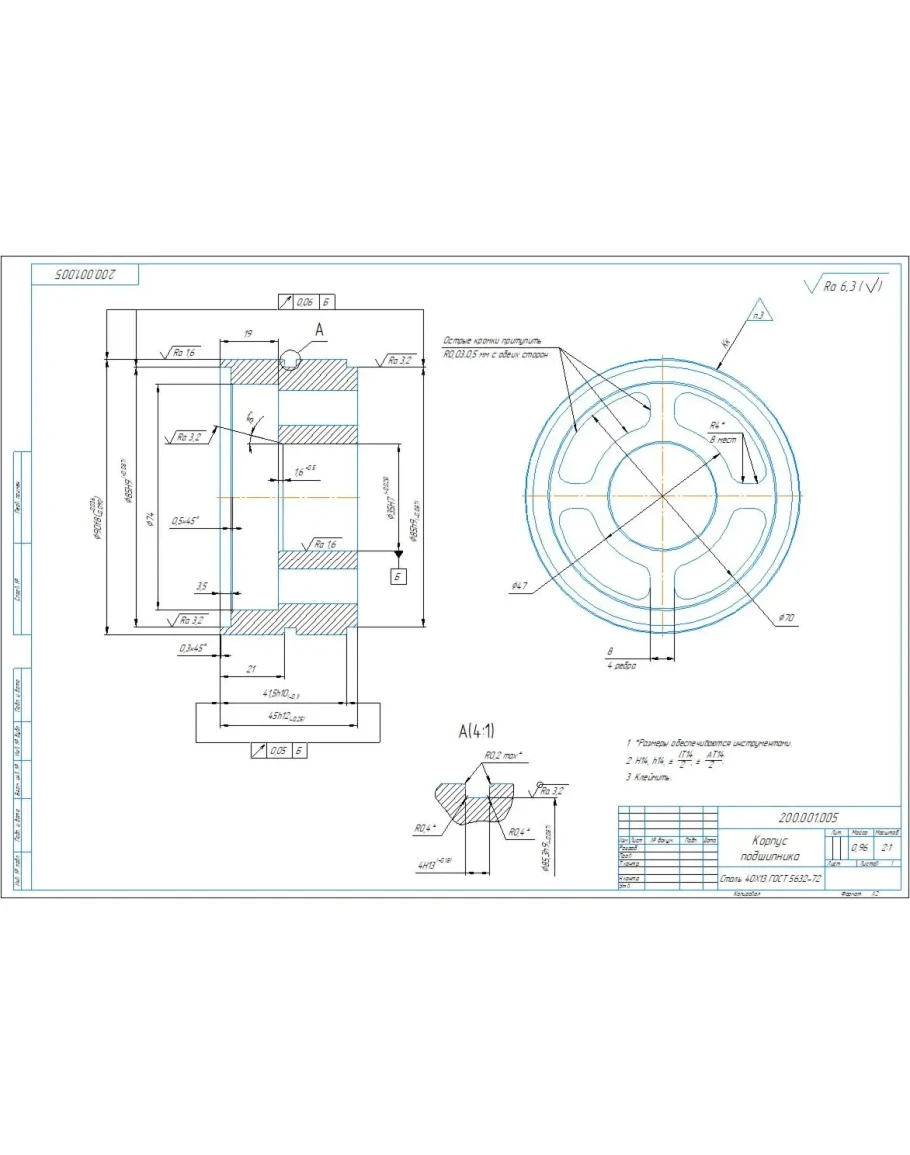 Рабочий чертеж детали корпус подшипника 200.001.005 в компасе