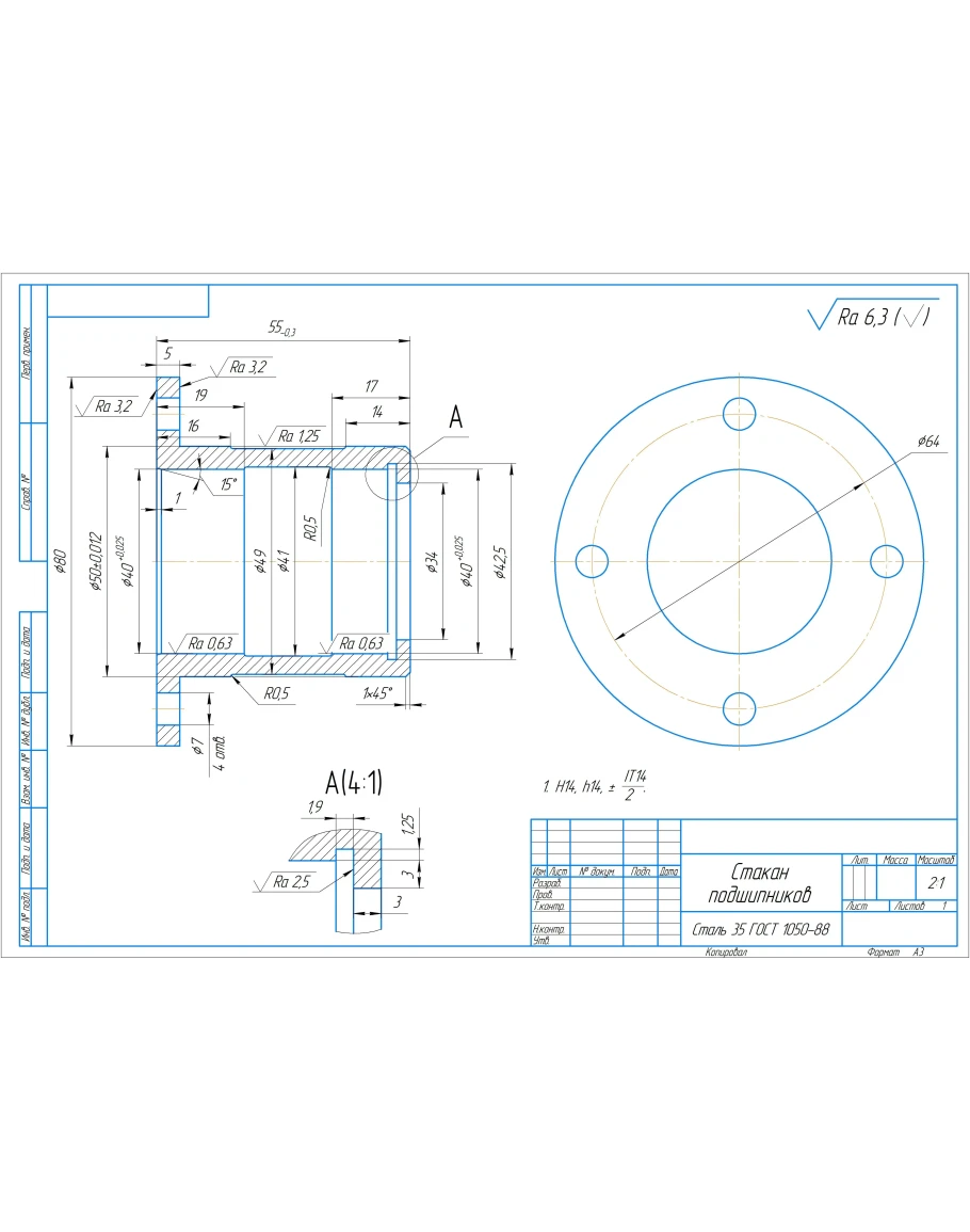 Чертеж детали "Стакан подшипников", выполненный по ЕСКД в Компасе версии 20.