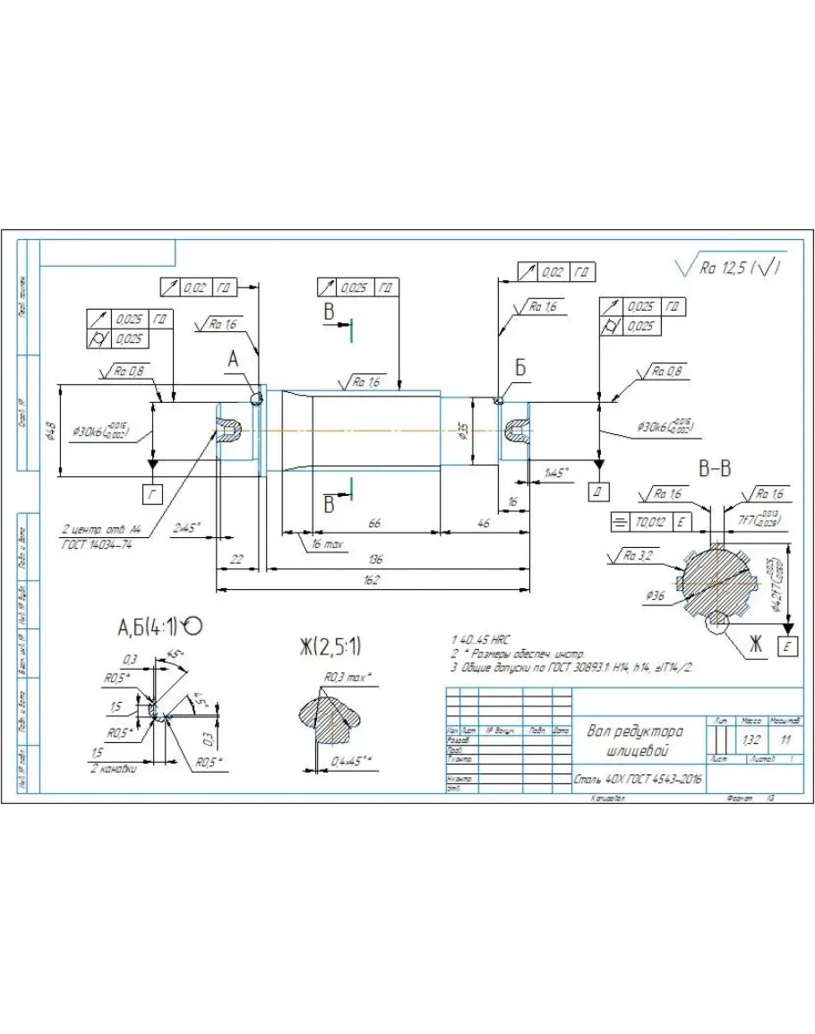 Рабочий чертеж детали вал редуктора шлицевой в программе Компас 3D