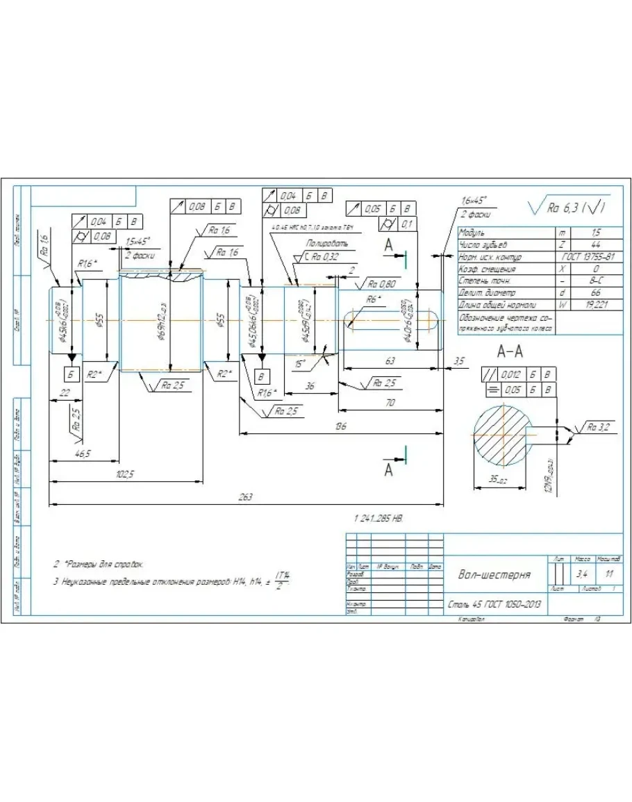 Чертеж детали вал-шестерня цилиндрическая m1,5 z44
