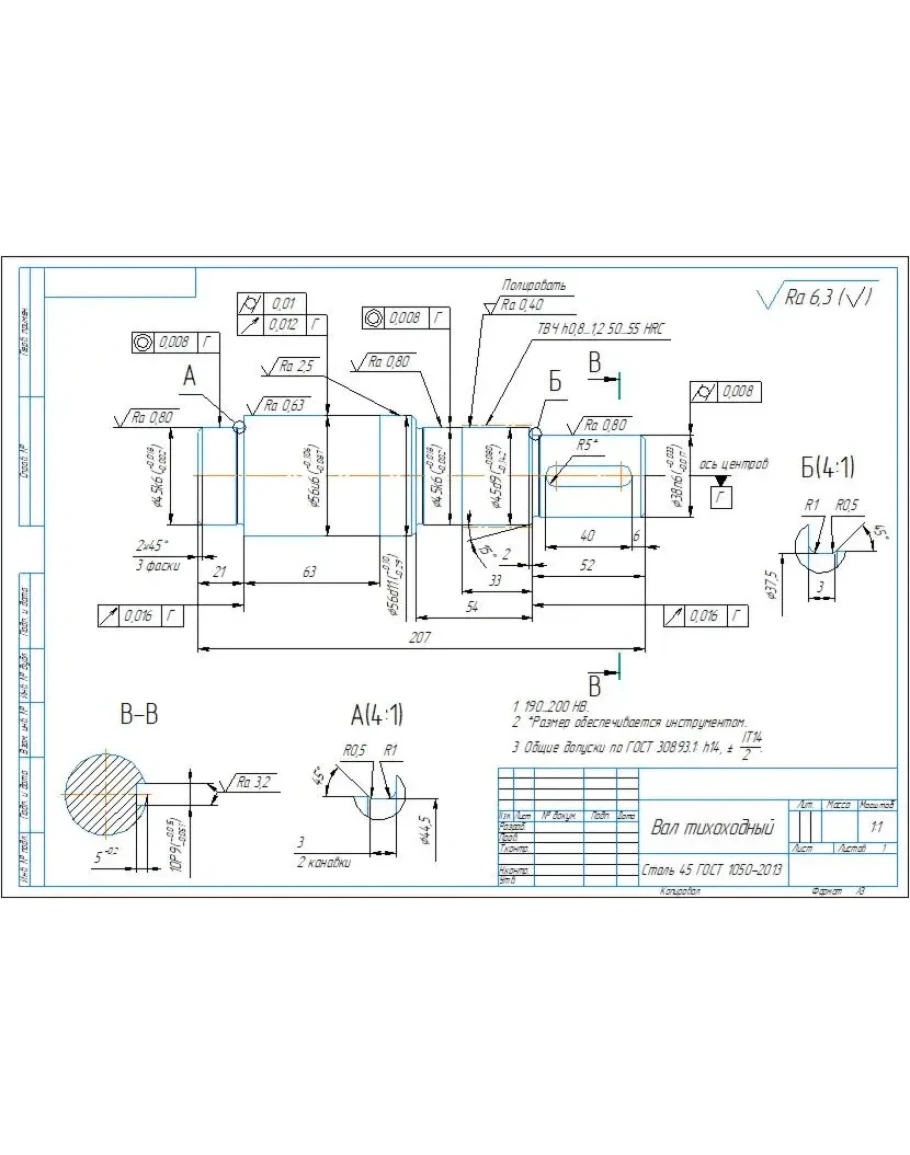 Рабочий чертеж детали вал тихоходный редуктора с посадочным диаметром под подшипники качения - d=45 мм. Чертеж выполнен в компасе
