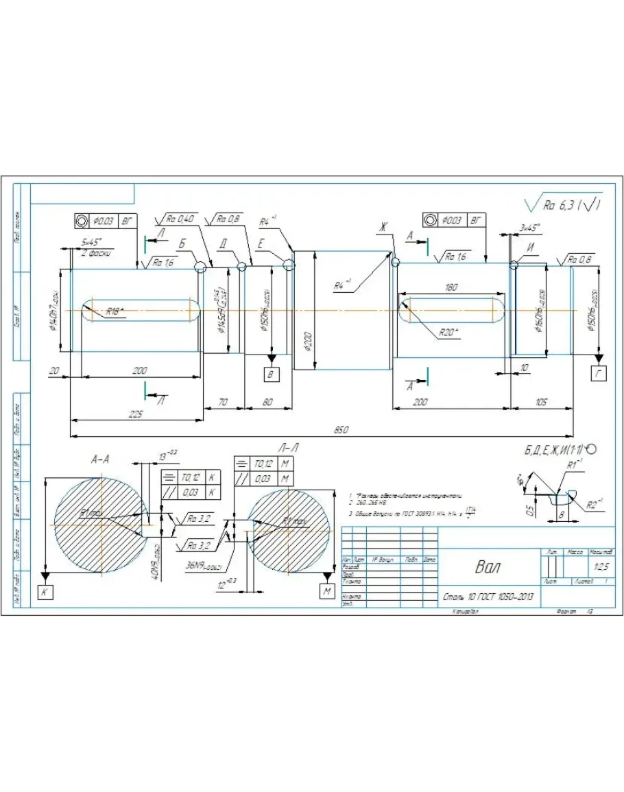 Рабочий чертеж детали вал с посадочным размером под подшипники качения 150 мм. Чертеж выполнен в Компас 3D