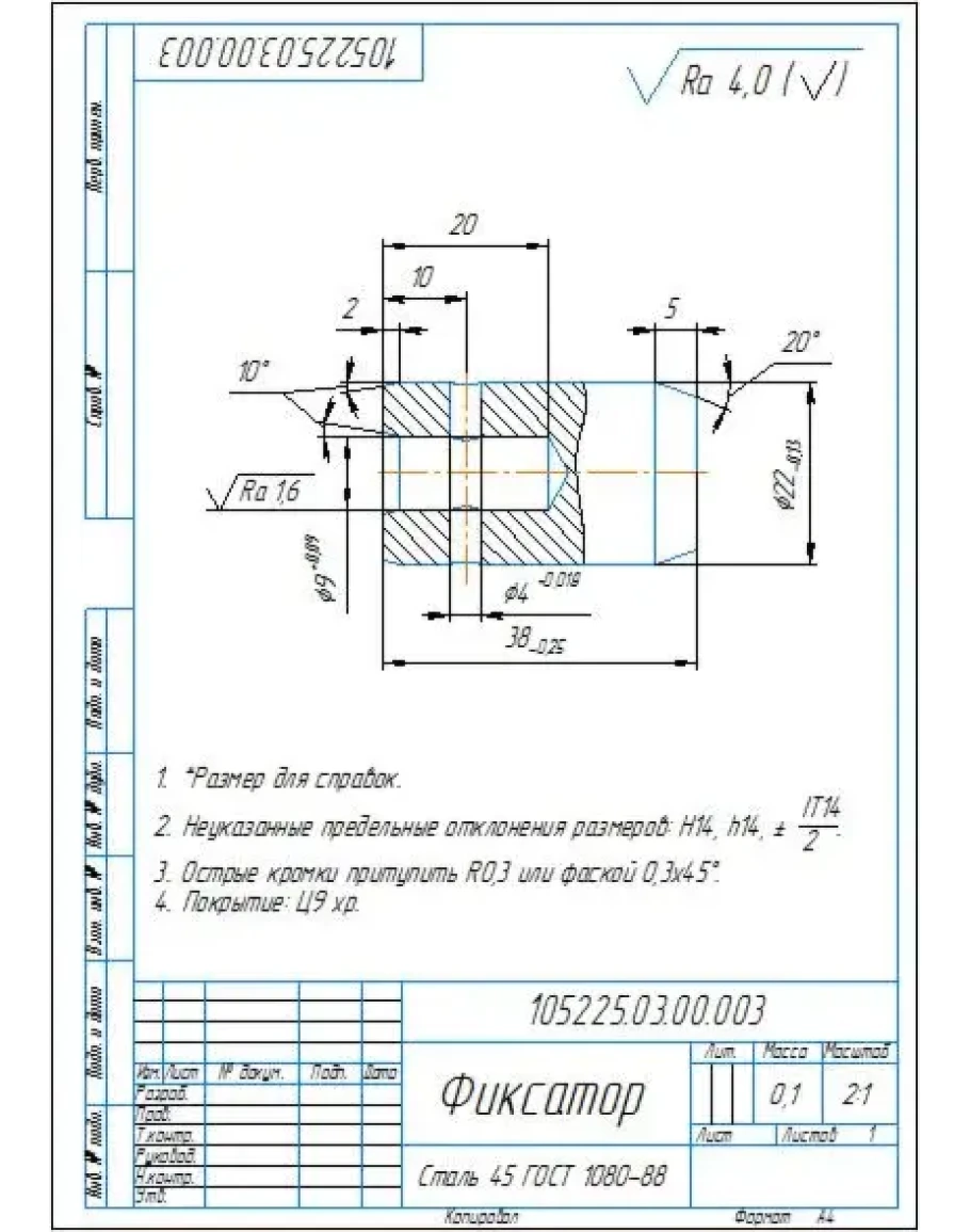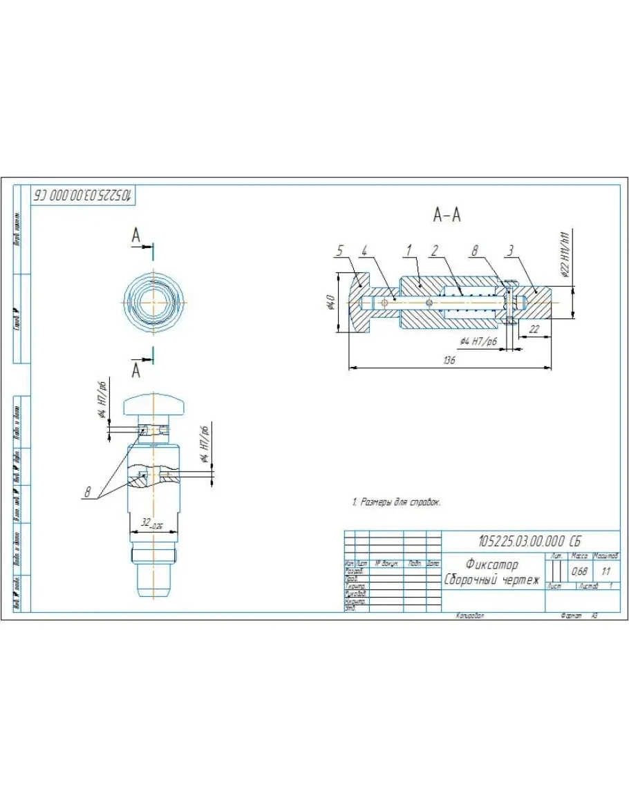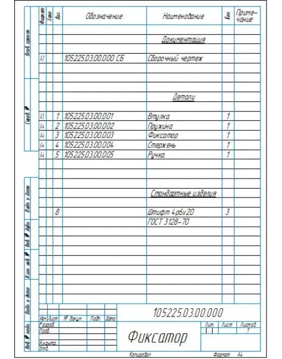 Сборочный чертеж, спецификация, деталировка сборочной единицы фиксатор. Чертежи выполнены в компасе.