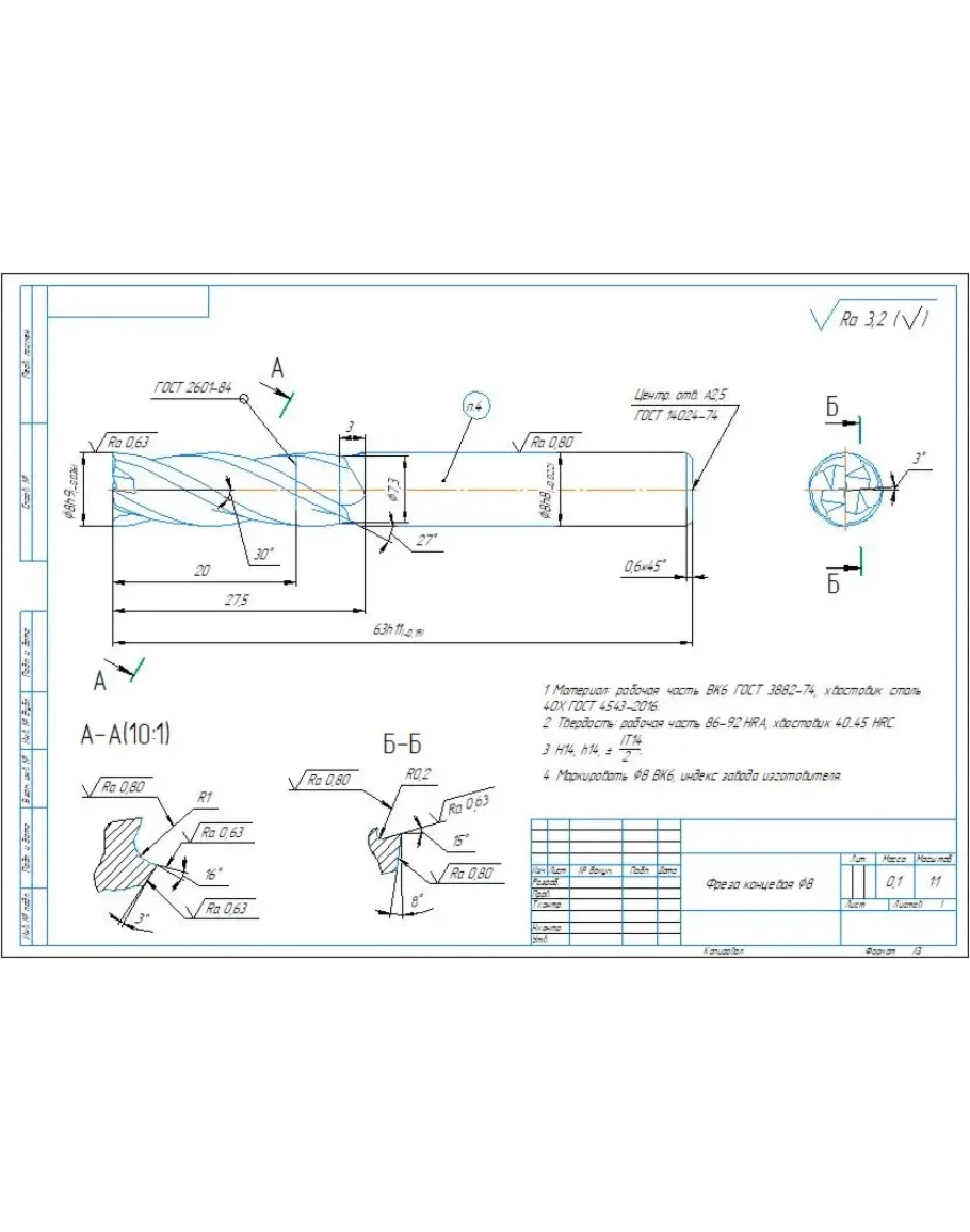 Чертеж фрезы концевой диаметром 8 мм в программе компас