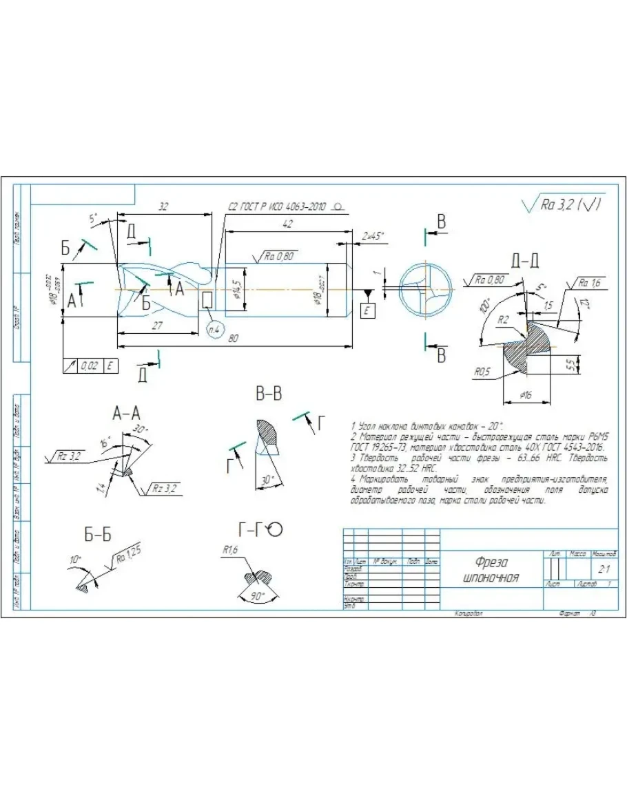 Рабочий чертеж фрезы концевой шпоночной диаметром 18 мм