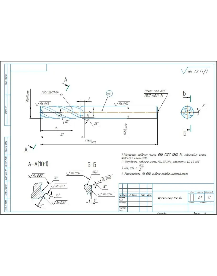 Чертеж фрезы концевой составной диаметром 6 мм в программе компас