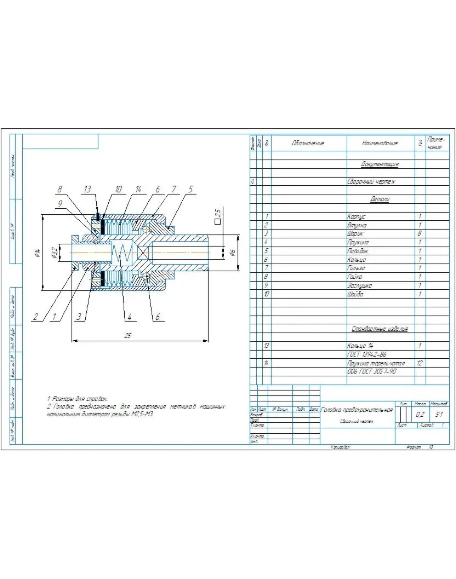 Сборочный чертеж и спецификация головки предохранительной для метчиков. Чертеж выполнен в компасе.