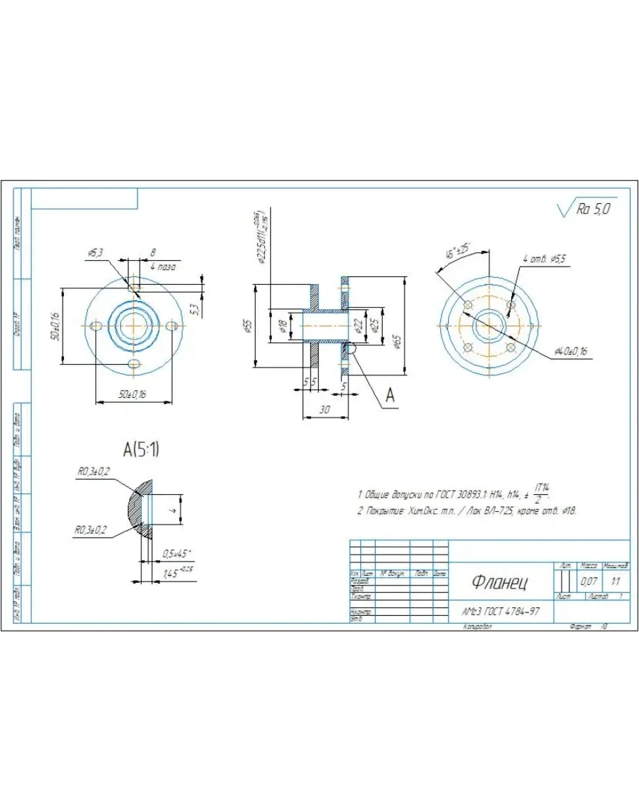 Рабочий чертеж и 3D модель детали "Фланец" в программе Компас 3D