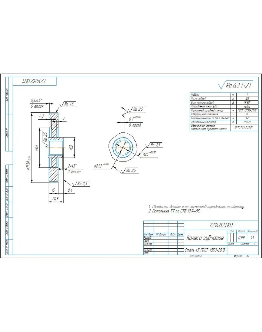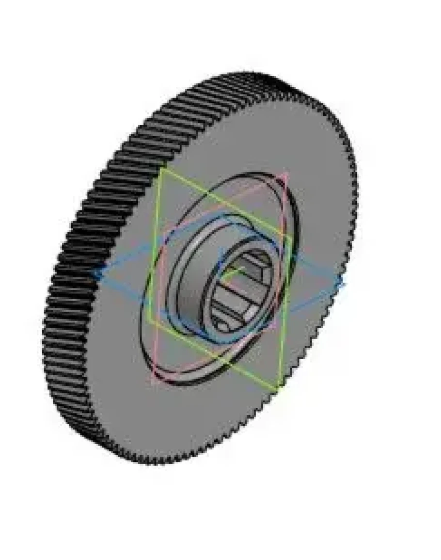 Рабочий чертеж и 3D модель детали колесо зубчатое с параметрами зубчатого венца: модуль m=1 мм, число зубьев z=105 шт.