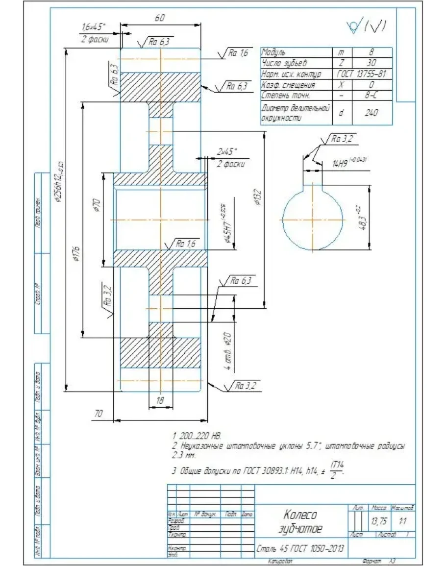 Чертеж и 3D модель детали колесо зубчатое m8 z30