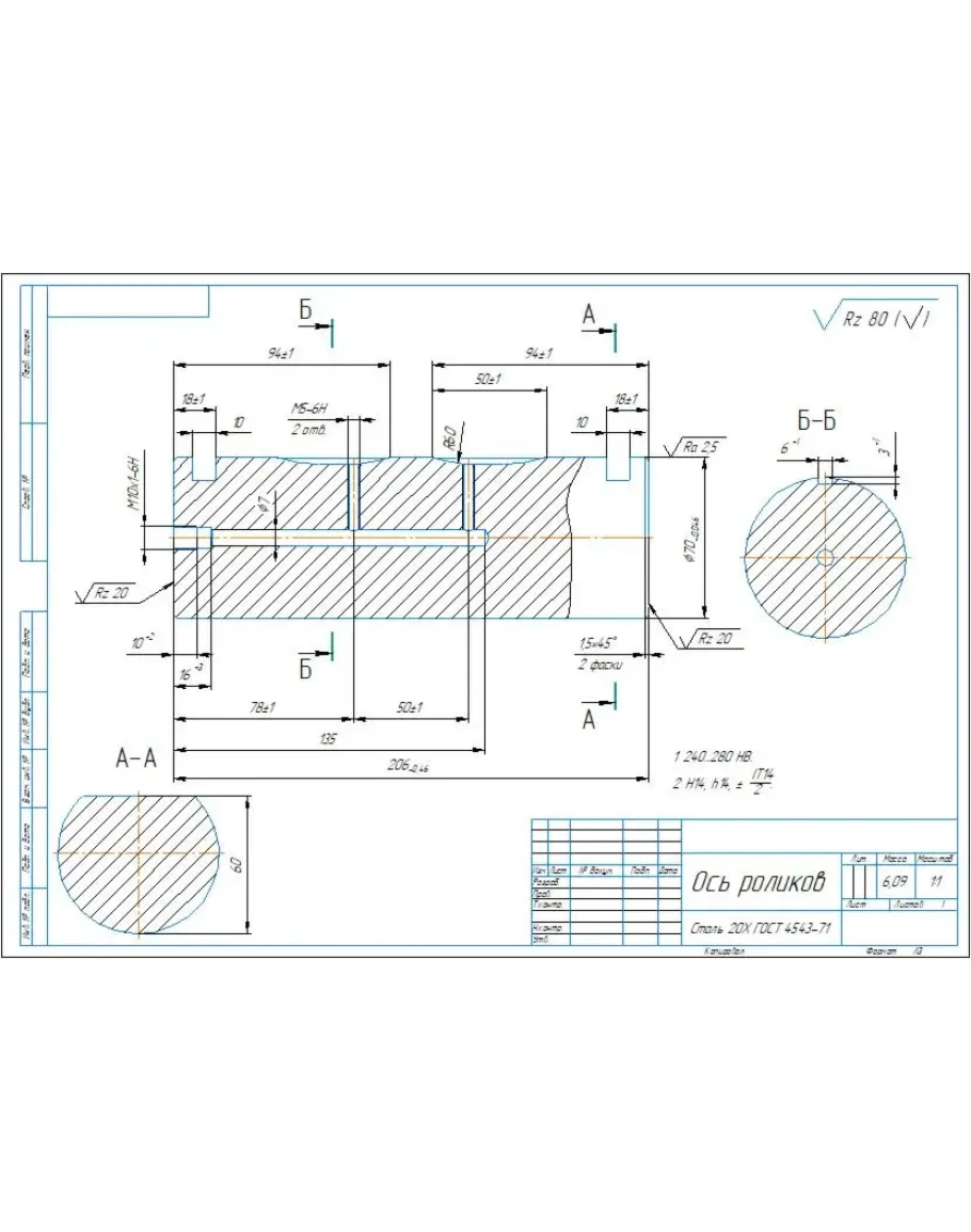 Рабочий чертеж и трехмерная модель (3D) детали ось роликов в программе Компас 3D
