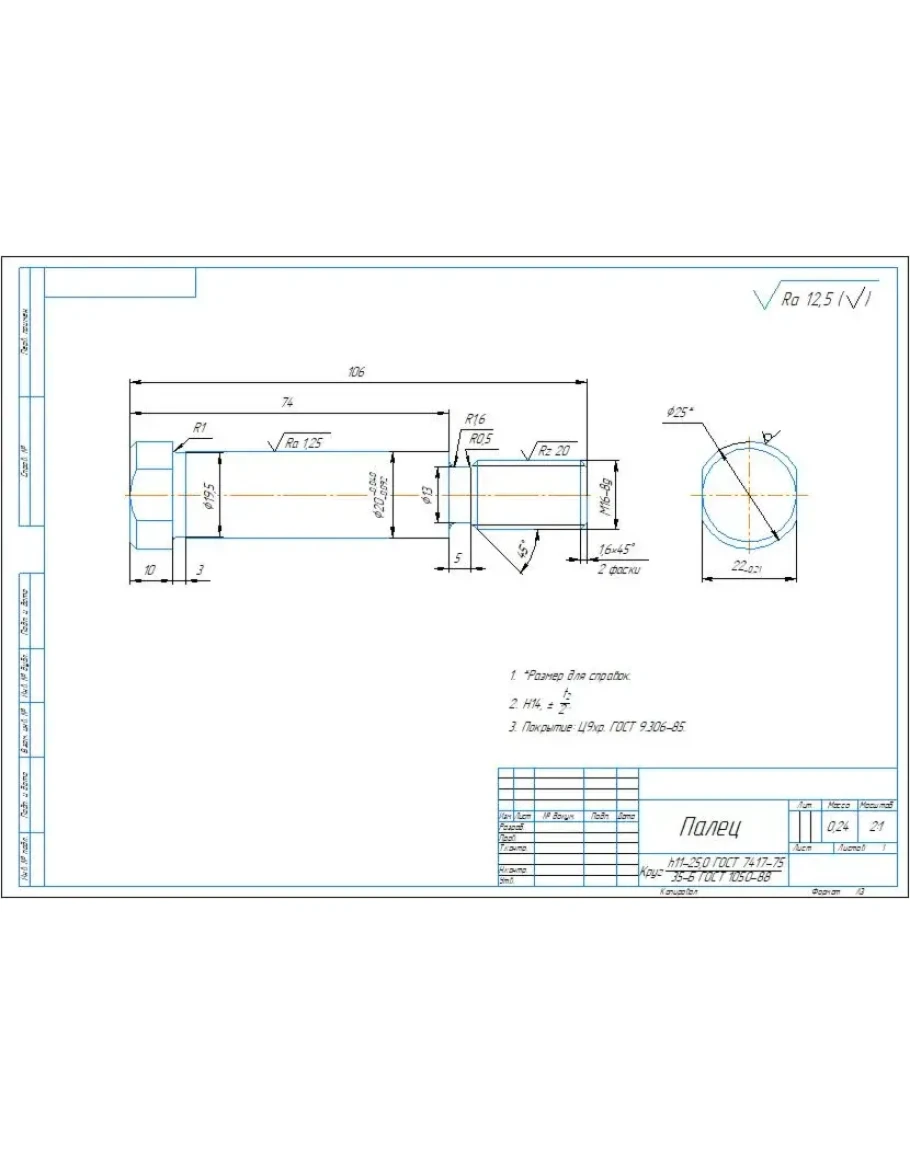Рабочий чертеж и 3D-модель детали палец скрепера ДЗ-87-1 в программе компас 3D
