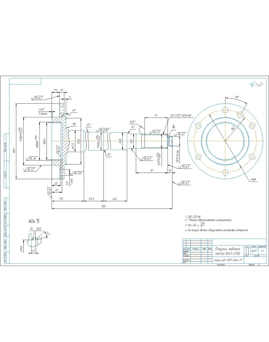 Чертеж и 3д-модель детали полуось заднего моста ВАЗ2106
