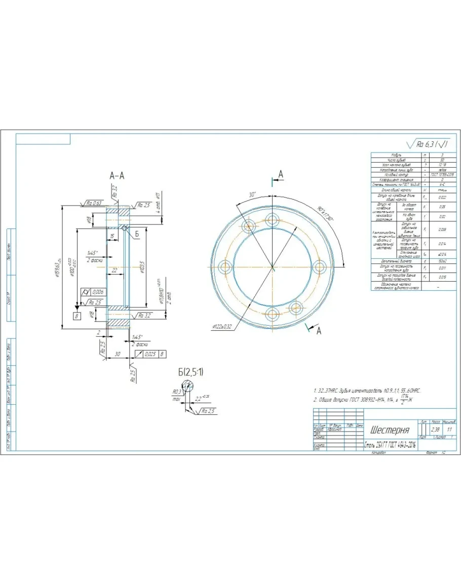 Рабочий чертеж и 3D модель детали шестерня с параметрами зубчатого венца: m=3 мм; z=50 шт.