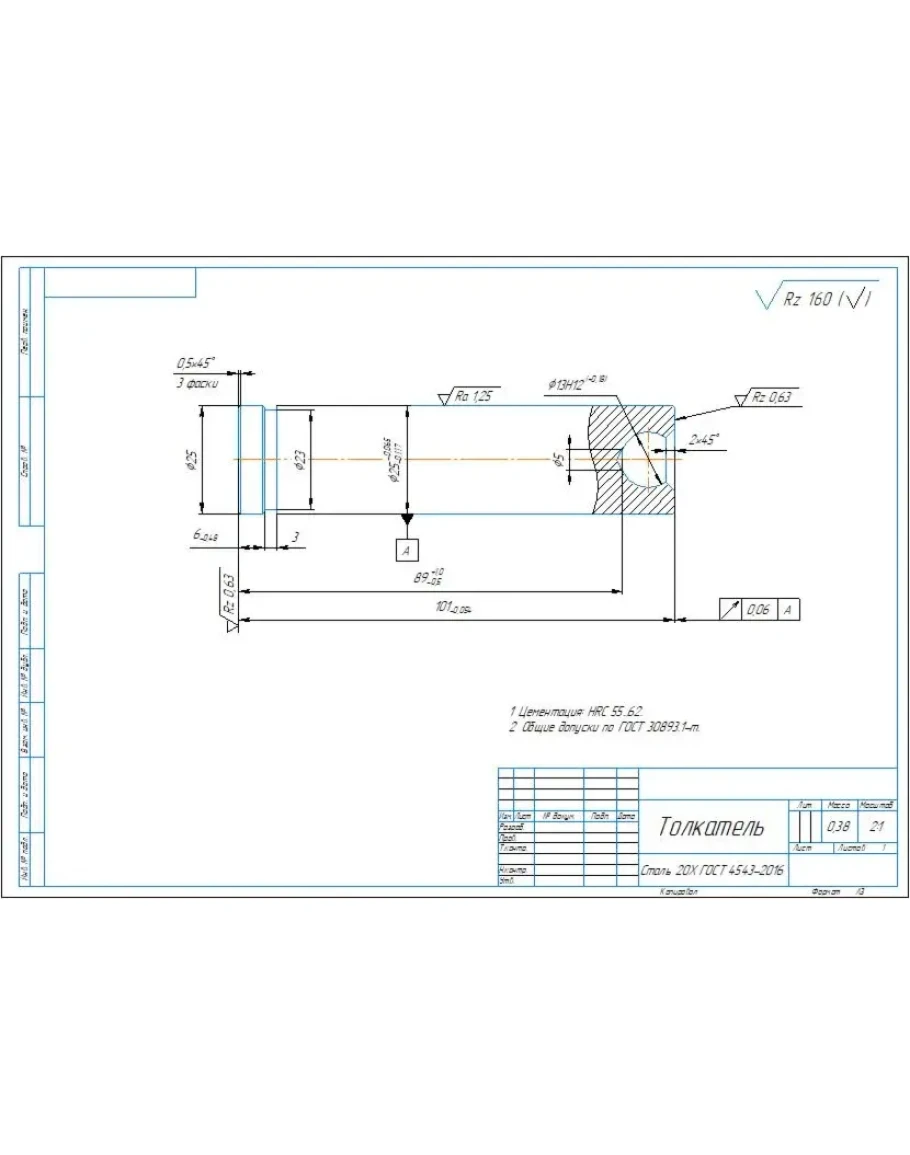 Рабочий чертеж и 3д-модель детали толкатель в программе Компас 3D