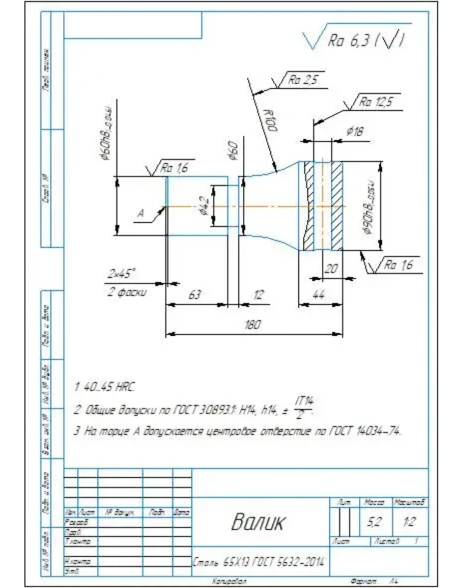 Рабочий чертеж и 3D модель детали Валик в программе Компас 3D