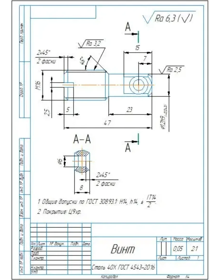 Чертеж и 3D модель детали "Винт" в программе компас 3D
