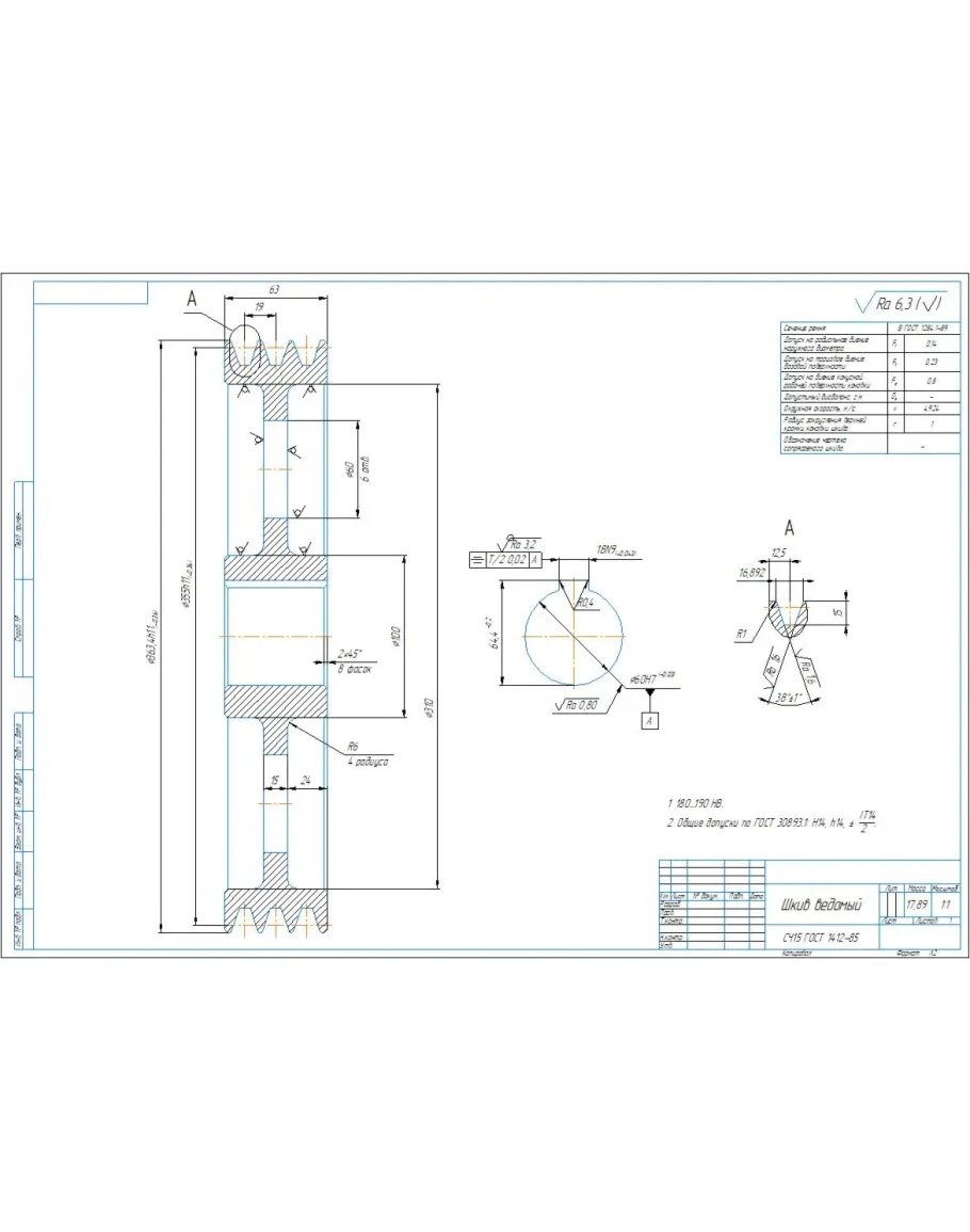 Рабочий чертеж и 3D модель шкива клиноременной передачи ведомого диаметром 355 мм