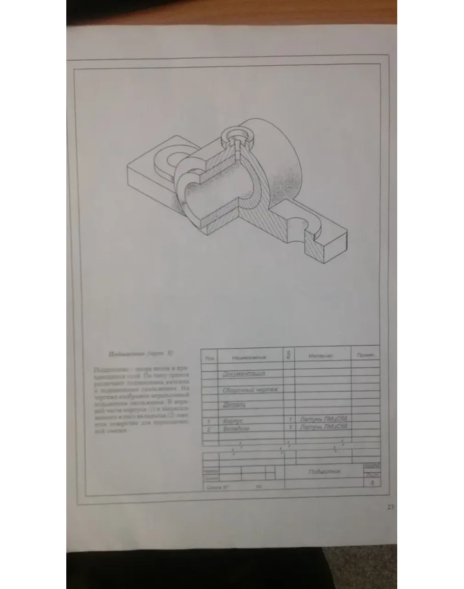 Подшипник - опора валов и вращающихся осей. По типу трения различают подшипники качения и подшипники скольжения. На чертеже изображен неразъемный подшипник скольжения. В верхней части корпуса (1) и запрессованного в него вкладыша (2) имеется отверстие для периодической смазки