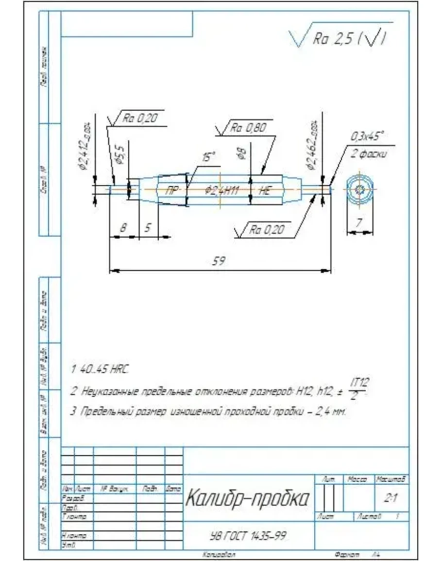 Рабочий чертеж калибра-пробки гладкого для отверстия 2,4H11 в компасе