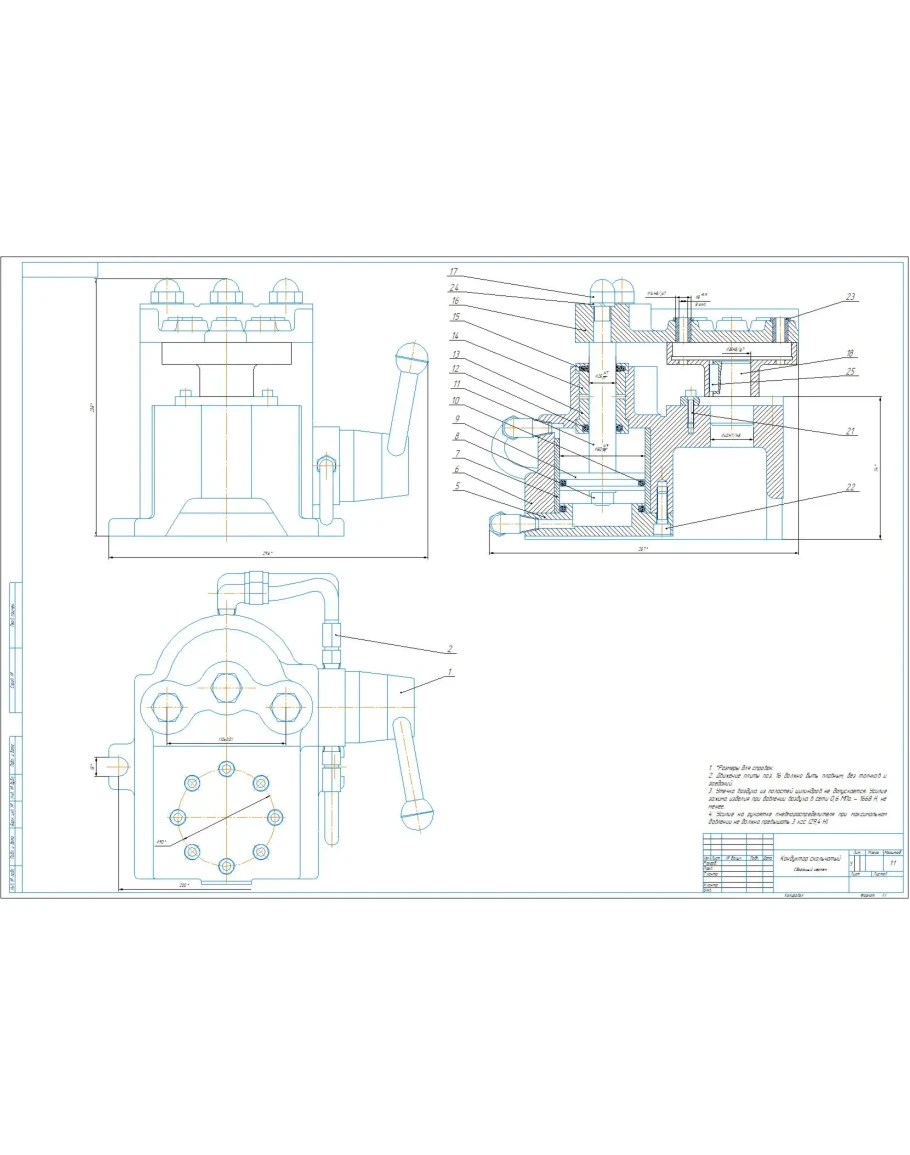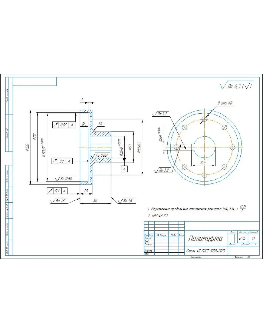 Сборочный чертеж и спецификация на кондуктор скальчатый сверлильный для обработки отверстий в детали полумуфта. Рабочий чертеж детали полумуфта также приложен. Чертежи и спецификация выполнены в компасе.