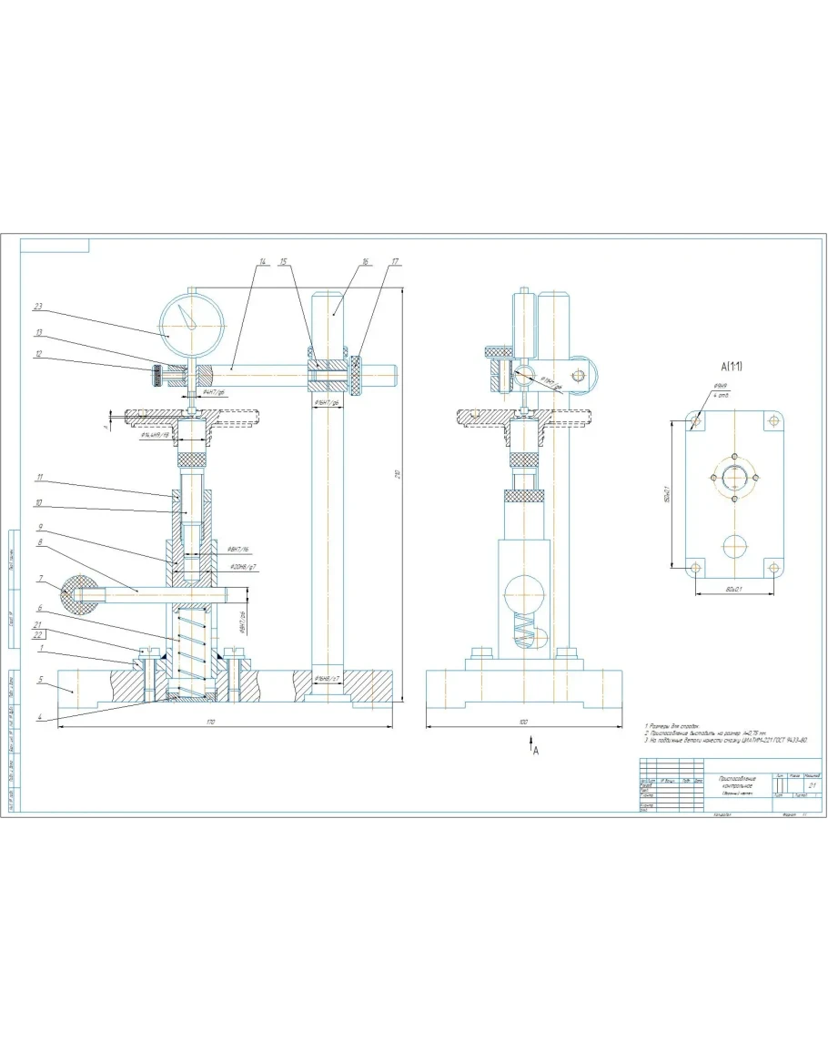 Сборочный чертеж и спецификация контрольно-измерительного приспособления (КИП) для контроля толщины перемычки в детали крышка. Также приложен рабочий чертеж детали крышка. Чертежи выполнены в компасе.