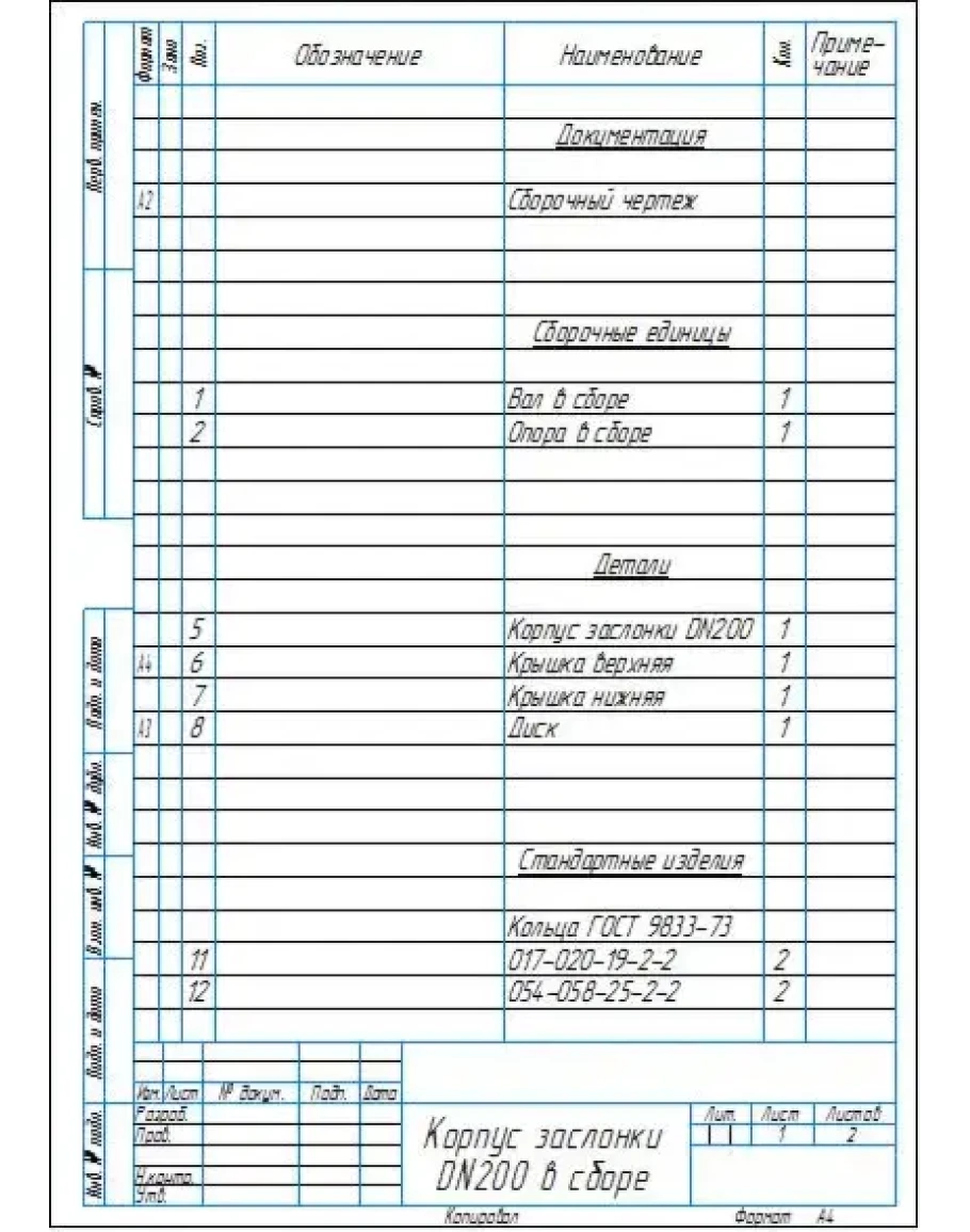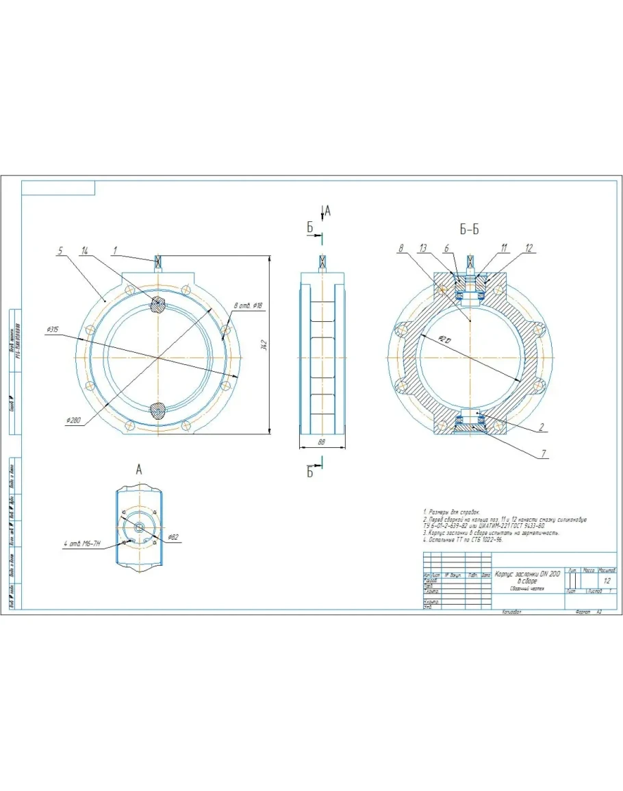 Сборочный чертеж и спецификация корпуса в сборе дисковой заслонки DN200 в компасе