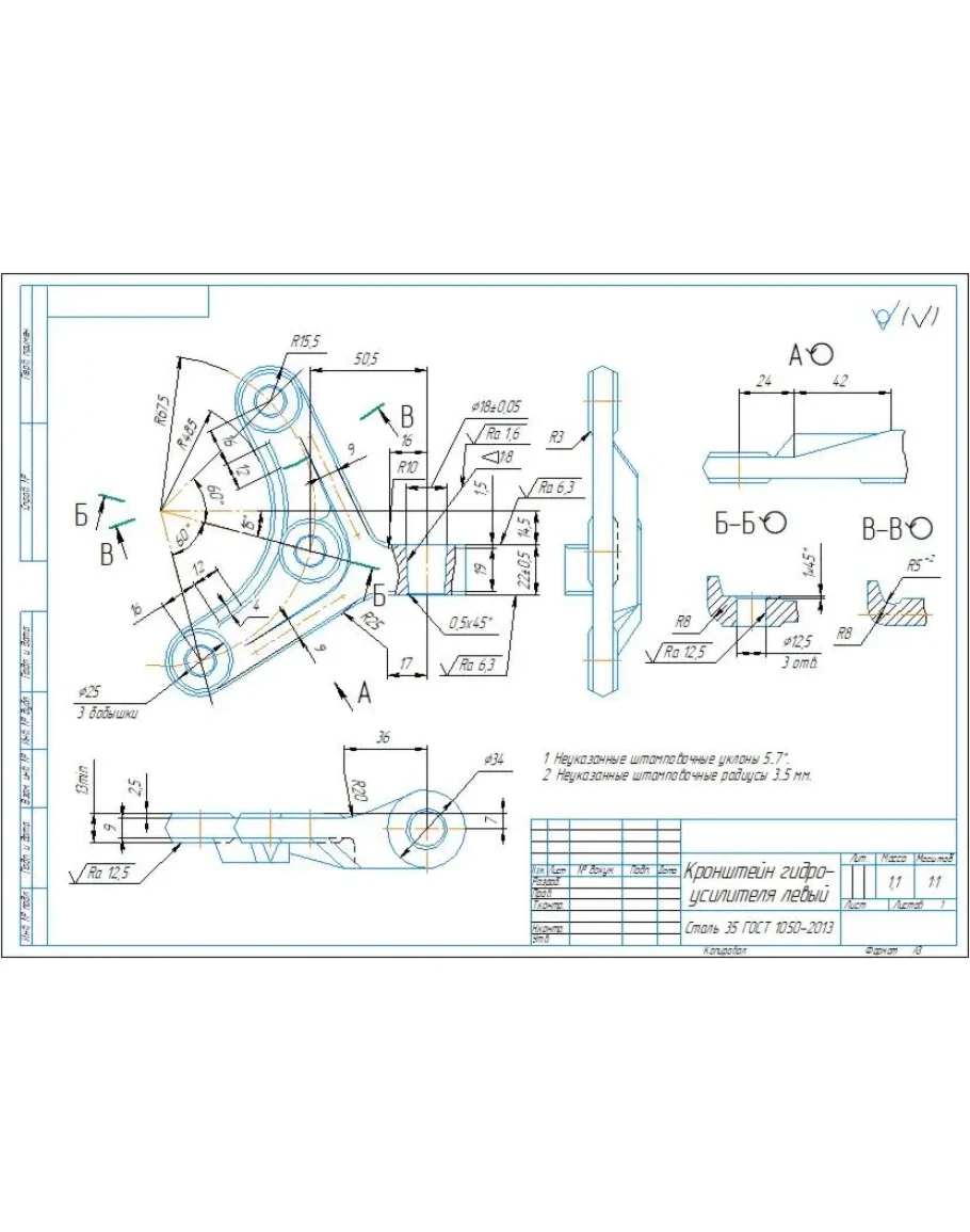 Рабочий чертеж детали кронштейн гидроусилителя левый в программе Компас 3D